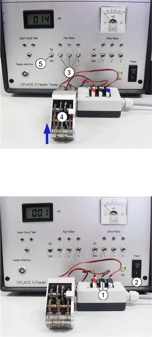 6 Checking and adjusting 3x8mm, 12-88mm S-Feeder 6.4 3x8mmS: Checking cover strip removal motor, track 1, 2 & 3 current input 110 SIPLACE S-Feeder Repair SIPLACE S-Förderer Reparatur 3. Turn the switch 1 (Track 1) up…