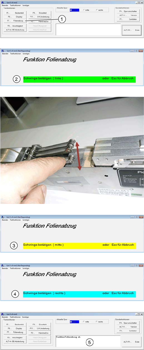 4 S-Förderer Test Software 4.2 Prüfen von 3x8mm S-Förderer SIPLACE S-Feeder Repair SIPLACE S-Förderer Reparatur 27 F7 Folienabzug 1. Starten Sie den Test "Fo lienabzug" mit der Taste F7 . 2. Drücken Sie die lin…