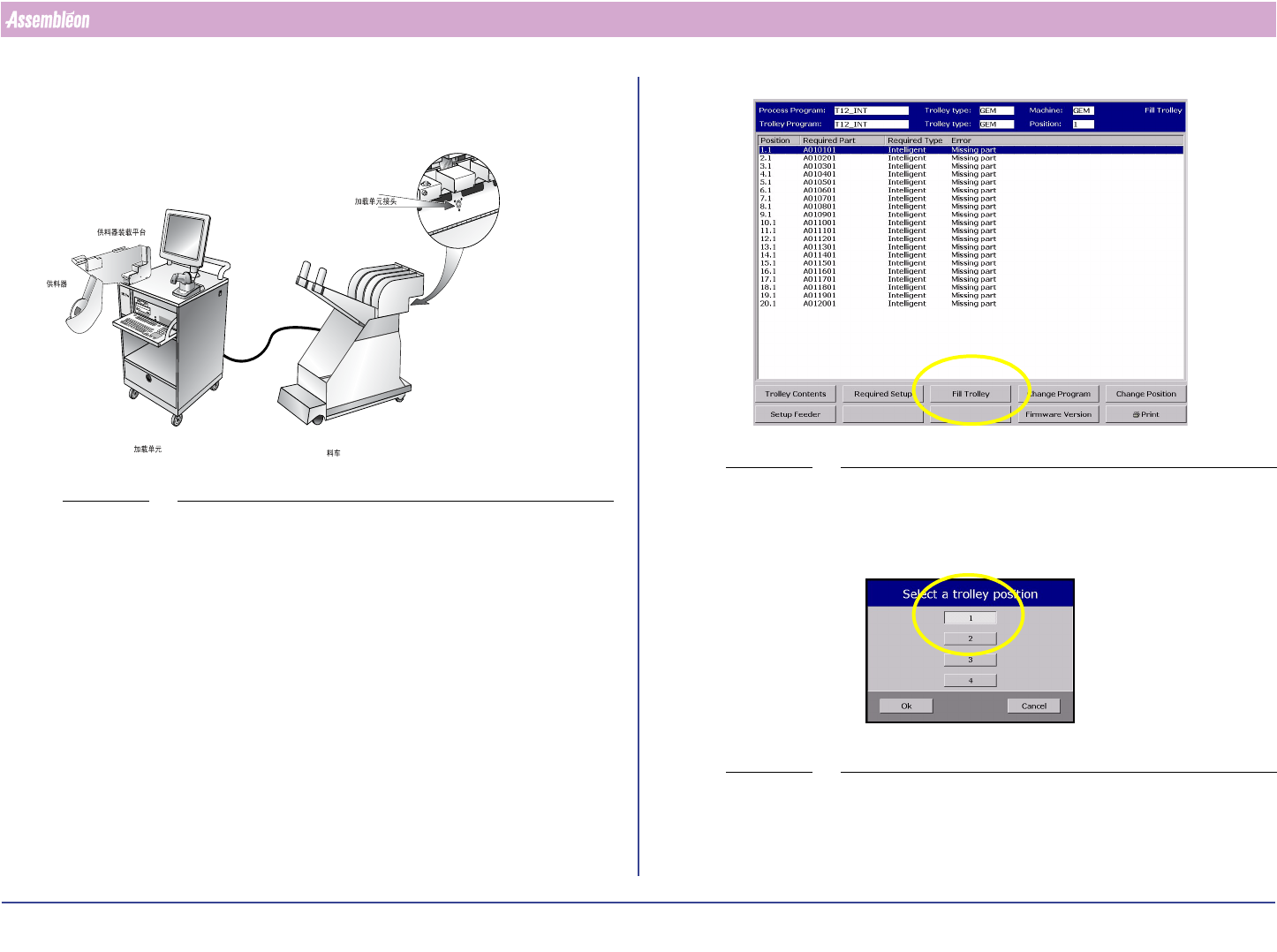 4022 591 90462 操作手册 05.02 SVS Pro 8 加载单元 1.4.1 填充料车 图 15 料车设置 ■ 选择: “必需的设置”可以获取当前贴片程序所需的所 有元件的列表。 ■ 选择: “填充料车” 。料车有两种填充方式: 1. 按照屏幕上的列表操作。 2. 从要装入该料车的一堆元件中随机选取一个元件。扫描 部件号。 • 将供料器放在加载单元上。 • 装载供料器 ( 请参阅 1.3 节 ) 。 • 装载供料器时将出…