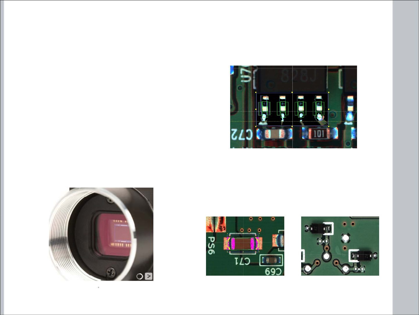 检测项目。元件本体,引脚,焊盘全自动定位,保证了高效,简单,稳定的检测。