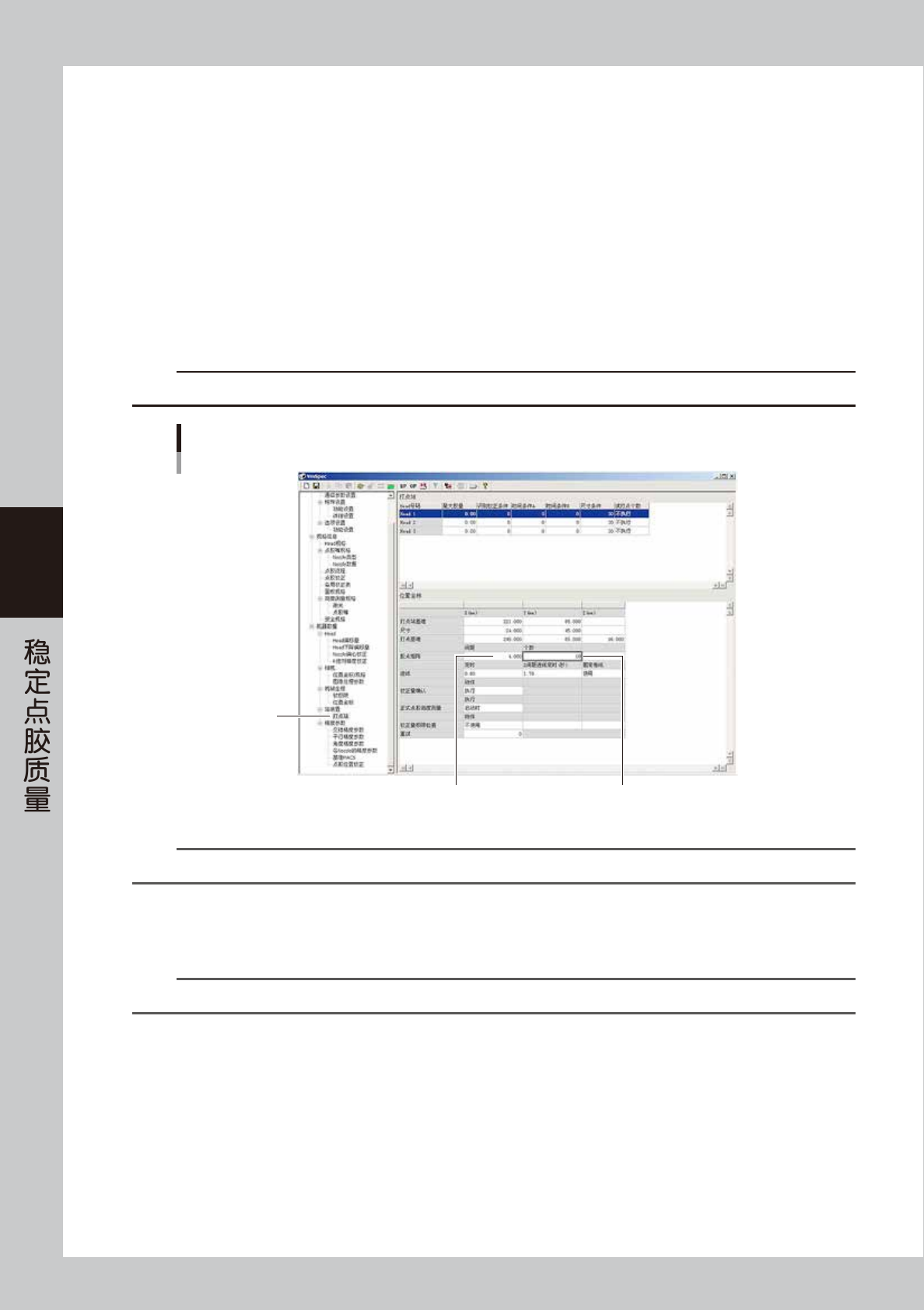 4-24 4 3.2.6 创建点胶校正表 接下来,需根据创建的标记与预点胶数据创建点胶校正表。创建点胶校正表,需在稳定的点胶状态下进行。因此, 创建之前请先确认胶筒内的胶量。若胶量足够,可以继续使用 ; 若所剩不多,需换上新胶筒。 下面,以 TYPE-111 为例介绍创建点胶校正表的方法。 1 更改试点胶的个数。 为增加在打点站可试点胶的个数,需修改机器设置中的试点胶最大个数的设置。更改方法如下 : 1. 按 [ 机器设置 ] 按钮,打…