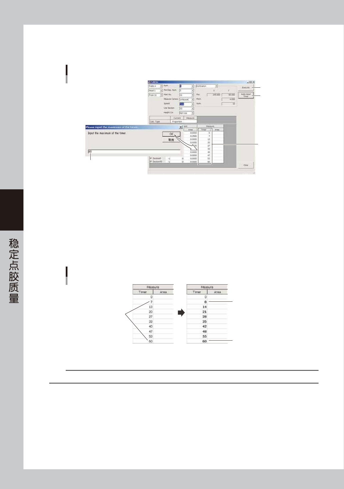 4-26 4 5 确认使用的点胶嘴用的最大、最小胶量。 1. 按 [Auto input Timer] 按钮,输入最大定时时间 ( 最大胶量 )。若不清楚最大定时时间时,可以输入 60( 最大胶量参考值 )。按 [OK] 按钮,各区域 (Setion) 中被均匀分配定时时间。 自动输入定时时间 输入最大定时时间(最大胶量) 定时时间(胶量) 2 1 66426-N7-00 2. 按 [Execute] 按钮,开始对各区域的定时时间测量胶…