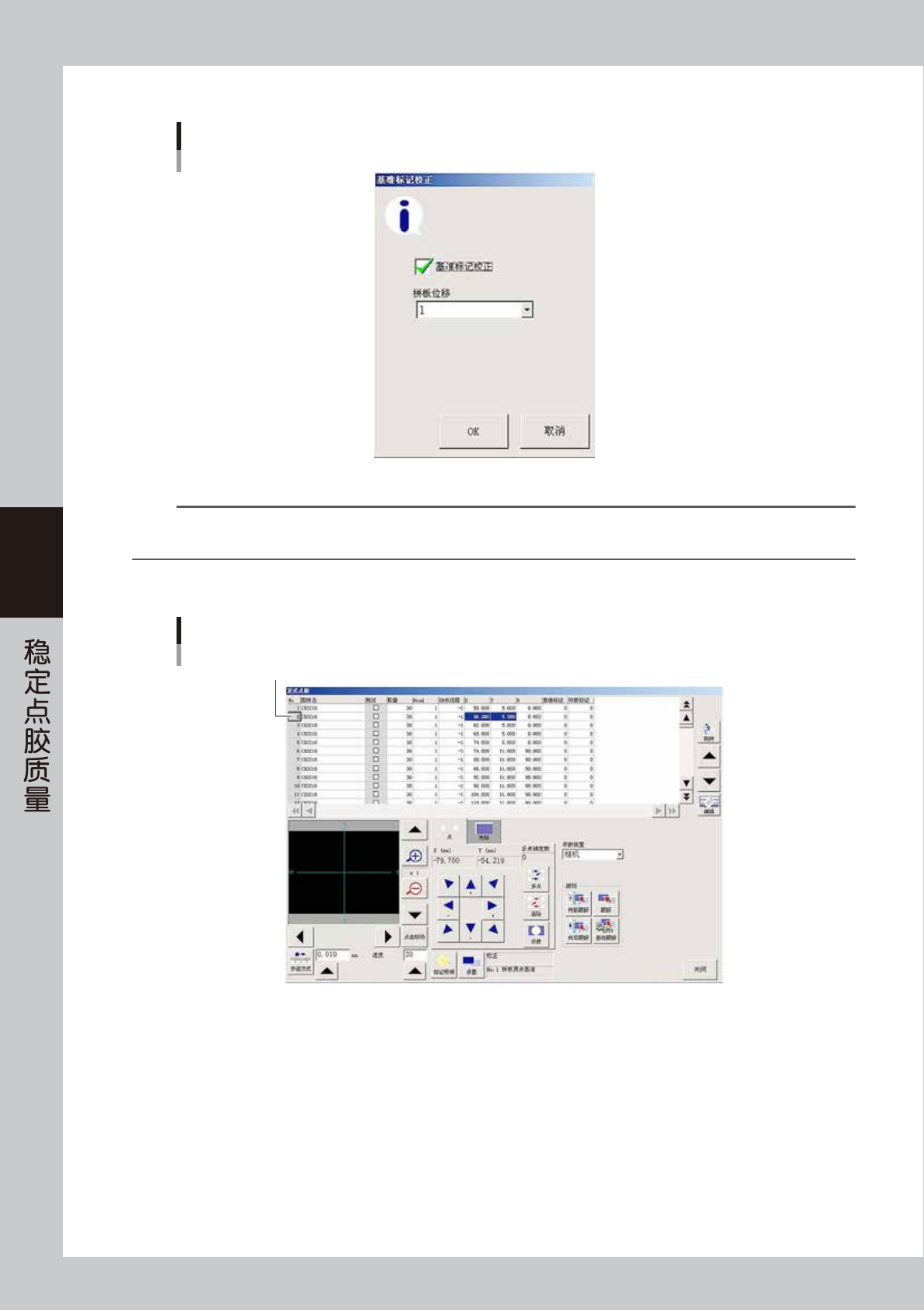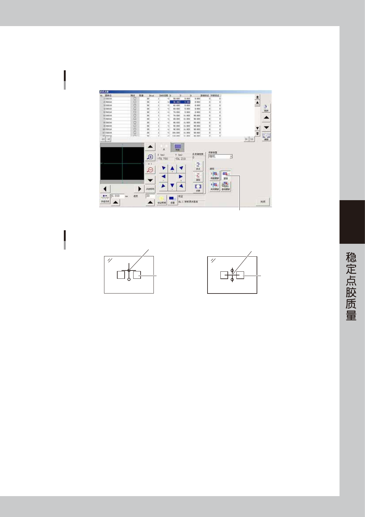 如果视窗中的十字光标偏离了点胶位置的中心,必须修正 X、Y 的数据。
