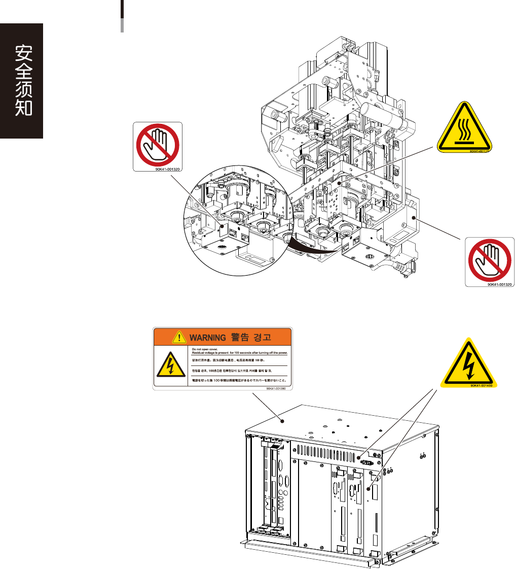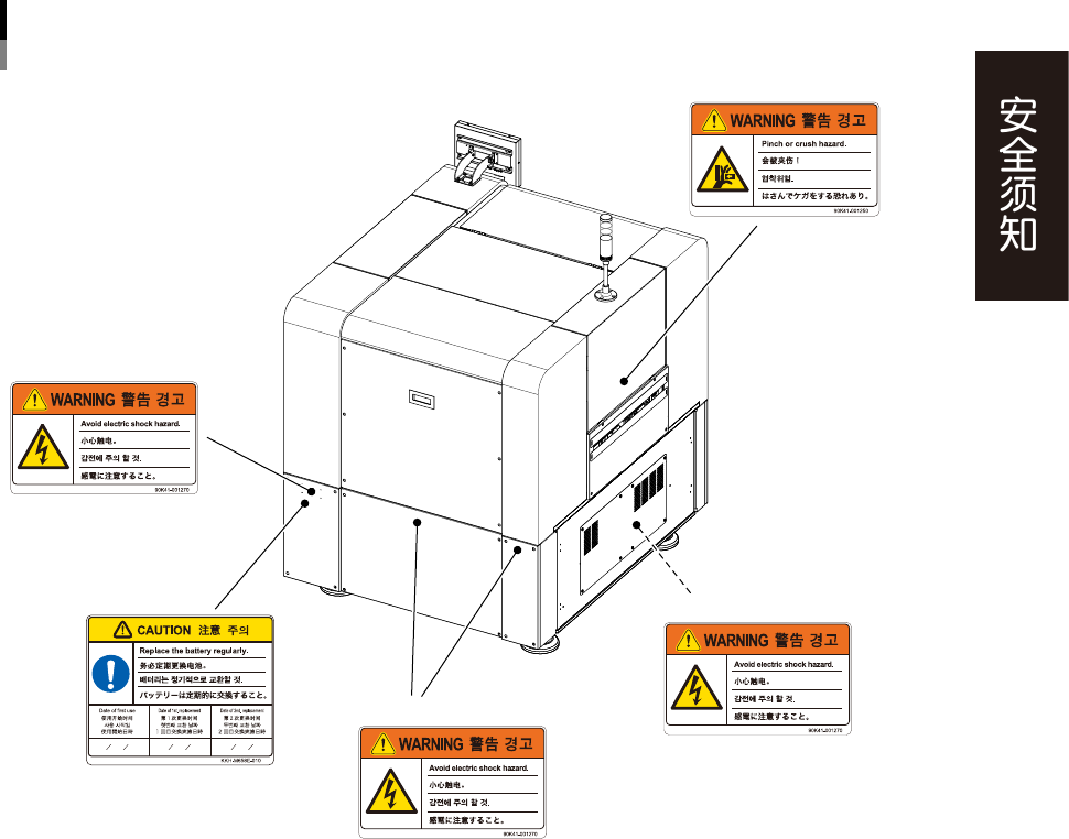 为了安全使用机器,如下图所示,在设备各个部位张贴了警告标贴,务必严格遵守标贴指示。此外,关于本节所