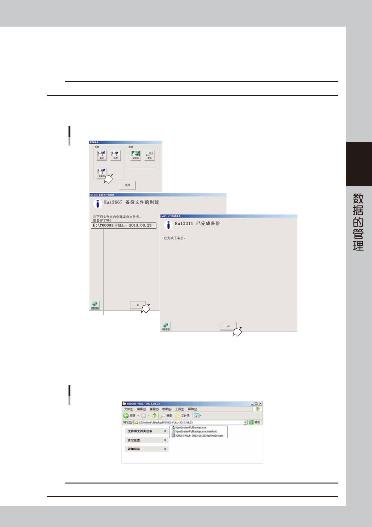 8-12 8 4 开始备份。 ■ 进行系统备份时 1. 按 [ 备份 ] 按钮。 2. 显示“备份文件的创建”对话框,确认保存位置后,按 [ 是 ] 按钮。 开始进行系统备份。 3. 系统备份结束后,显示“已完成备份”对话框。 按 [OK] 按钮,关闭画面。 系统备份 确认保存位置 66813-N7-00 4. 返回“系统备份”画面后,按 [ 关闭 ] 按钮,关闭画面。