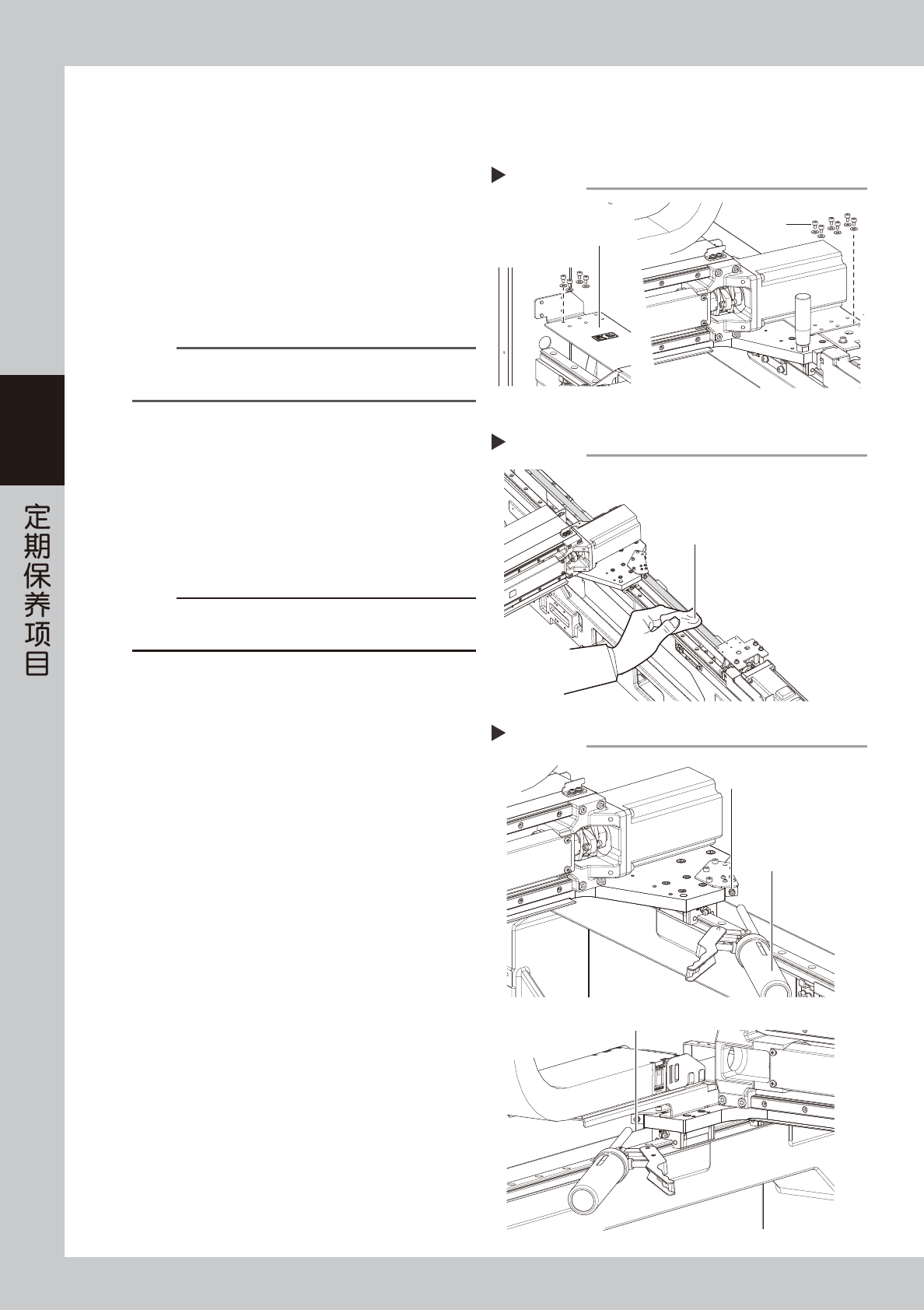 下面,介绍清洁 X、Y 轴滚珠丝杆、导轨的方法与加油的方法。关于加油位置与加油方式,请参阅第 5 章“加油位