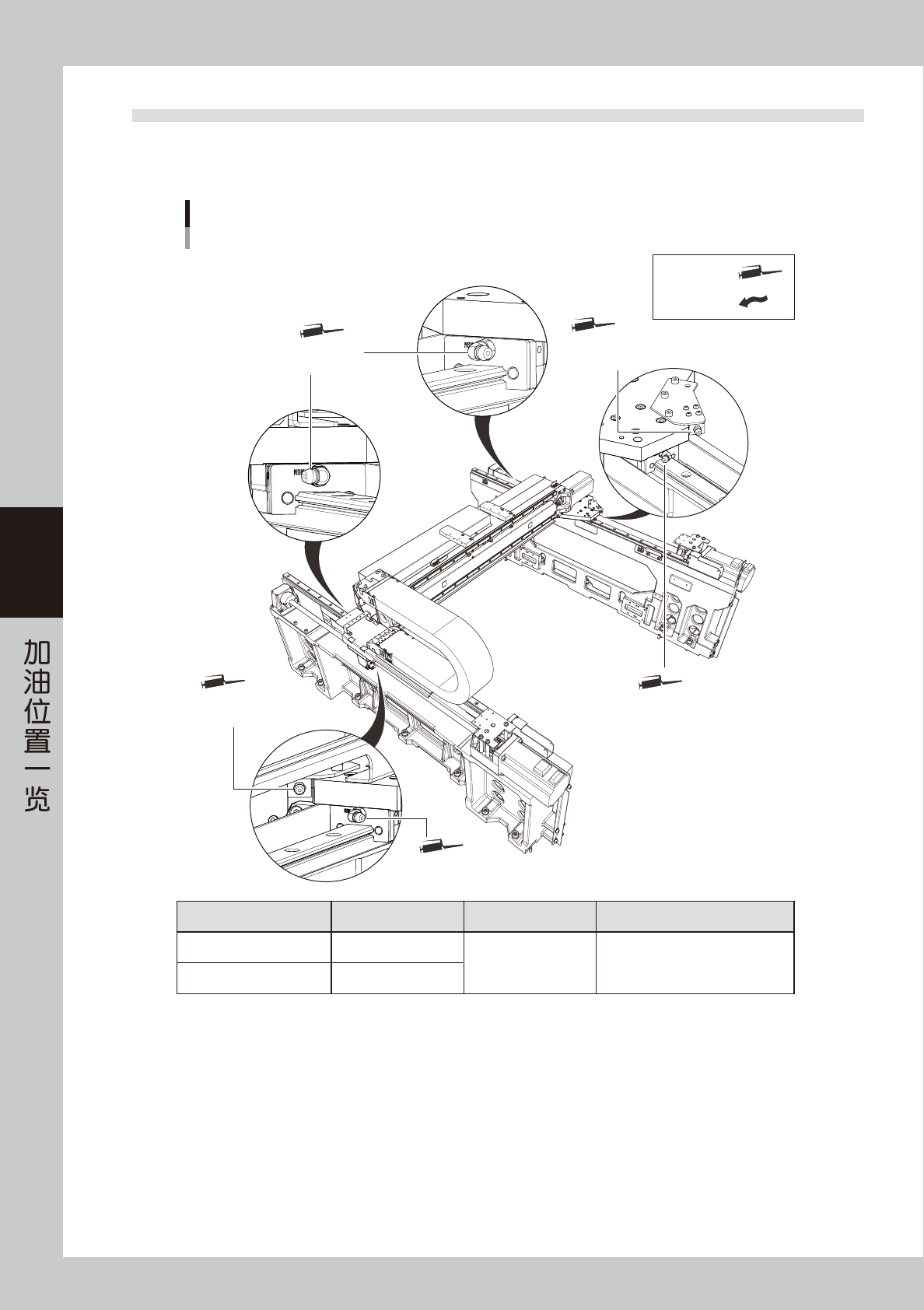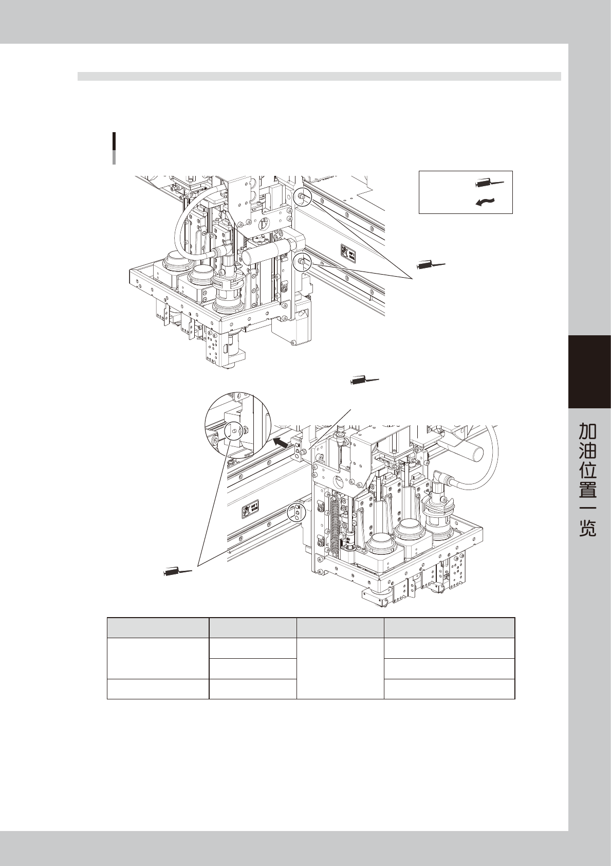 4-4 4 2.3 Y 轴部 2.3.1 Y 轴导轨与滚珠丝杆 Y轴的加油位置 导轨与滚珠丝杆 Y轴导轨部 润滑油注油嘴 Y轴导轨部 润滑油注油嘴 润滑油枪 : 用手涂抹 : Y轴导轨部 润滑油注油嘴 Y轴滚珠丝杆部 润滑油注油嘴 背面 正面 Y轴滚珠丝杆部 润滑油注油嘴 加油部位 加油位置 频率 加油方法 导轨 4 1次/月 润滑油枪 : 标准枪嘴 滚珠丝杆 2 55503-N7-00