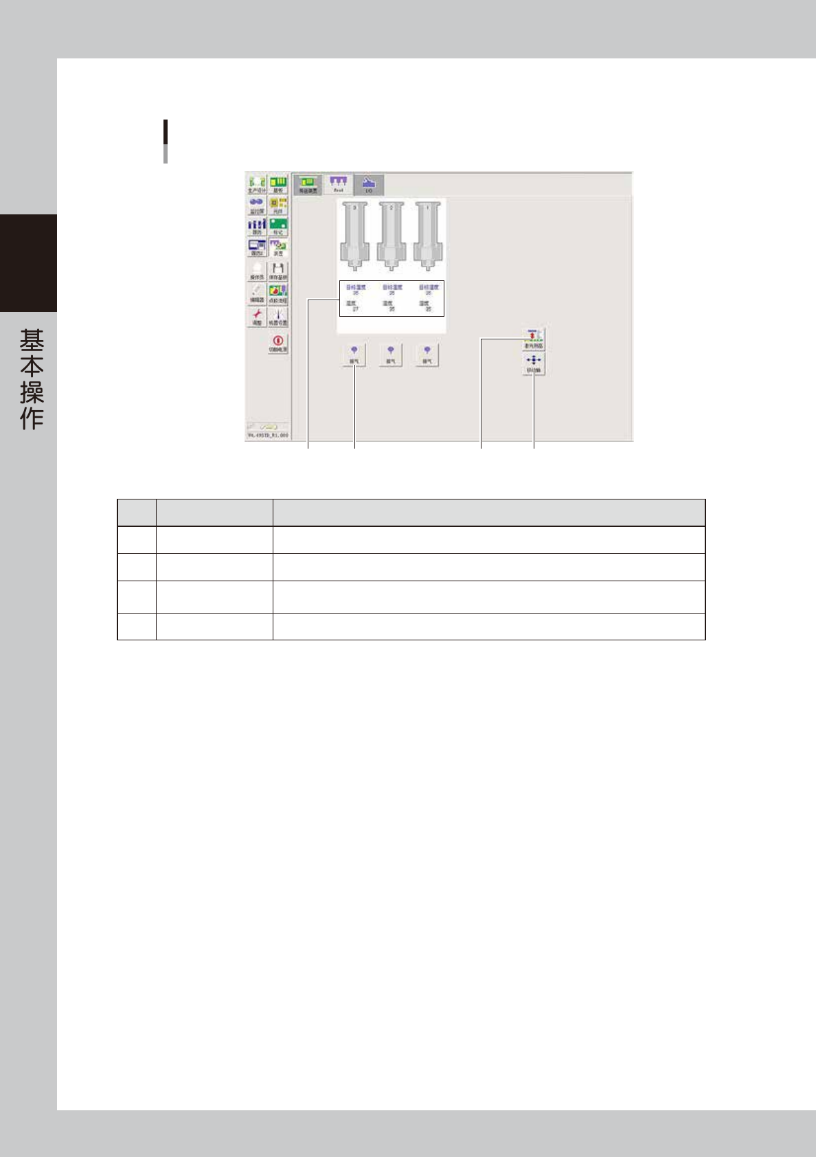 2-1 1 2 ■ I/O 手动操作画面 “装置”画面 “I/O”选项卡 1 2 3 26212-N2-00 名称 功能 1 “输出信号”下拉框 从下拉框中选择需要查看的输出信号。 ‧ Head ‧ 传送装置 ‧ 其它 2 “输入信号”下拉框 从下拉框中选择需要查看的输入信号。 ‧ Head ‧ 传送装置 ‧ 其它 ‧ 原点极限 ‧ 备用 ‧ 联锁 3 [ ON/OFF ] 按钮 打开或关闭光标选中位置的阀。