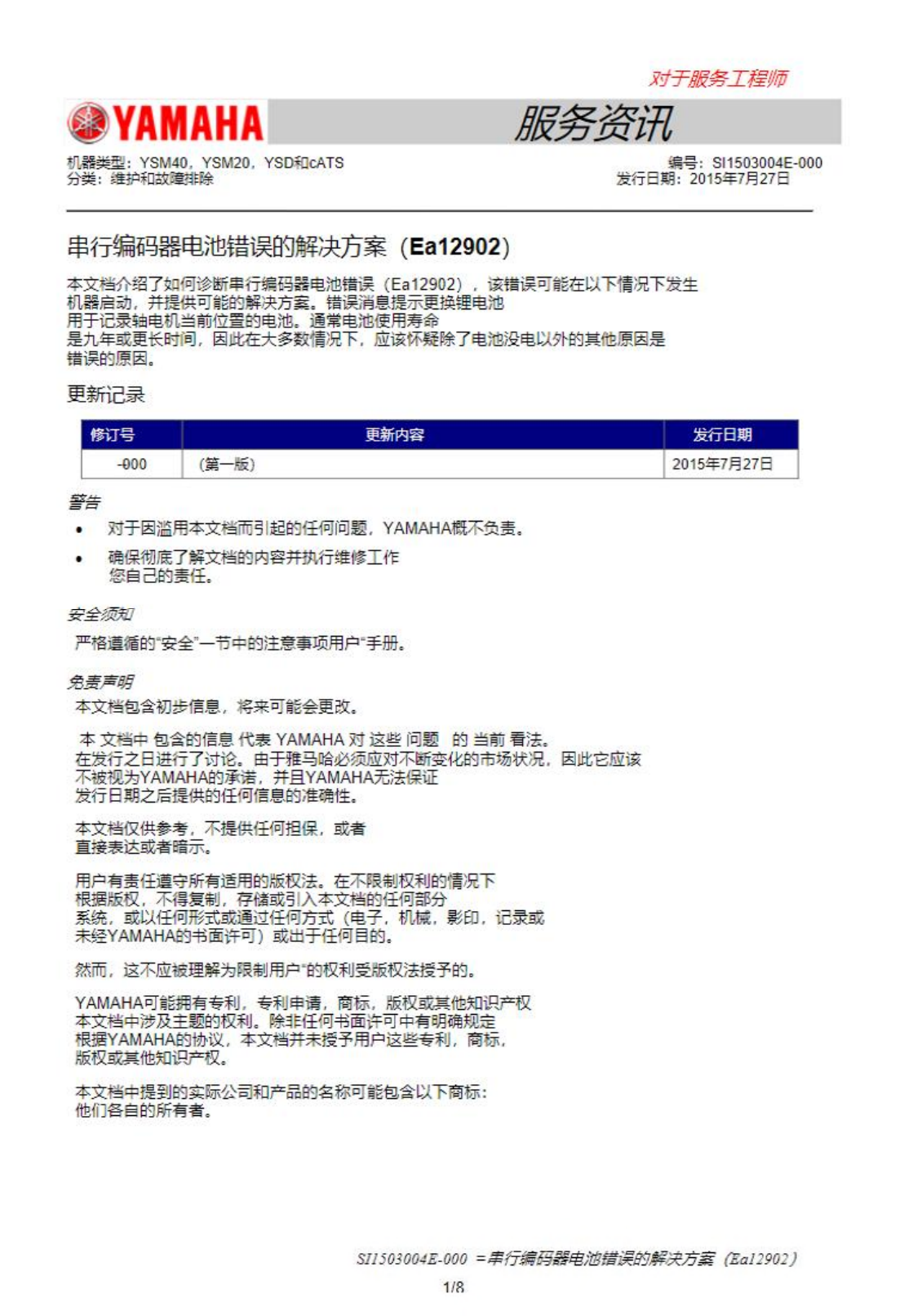 射于跟务工程师 服务资讯 ■ YAMAHA 目泉 1 个 ¥ 行编码器电池的功能及其错误指示 < 1 妇功能的的串行编码器电池 10 > 2 指示的所述电 ® 误差 2 个串行编码器电池的右局 3 鍾电池綱子 & 9 电 S 3 3 3 ■ 5 6 5 更痪 ¥ 行编码 S 电 , , 5.1 更换零件 a & 5.2 更换程序 . 8 SI 1503004 E - 000 = 串行编码器电池错误的解决方…