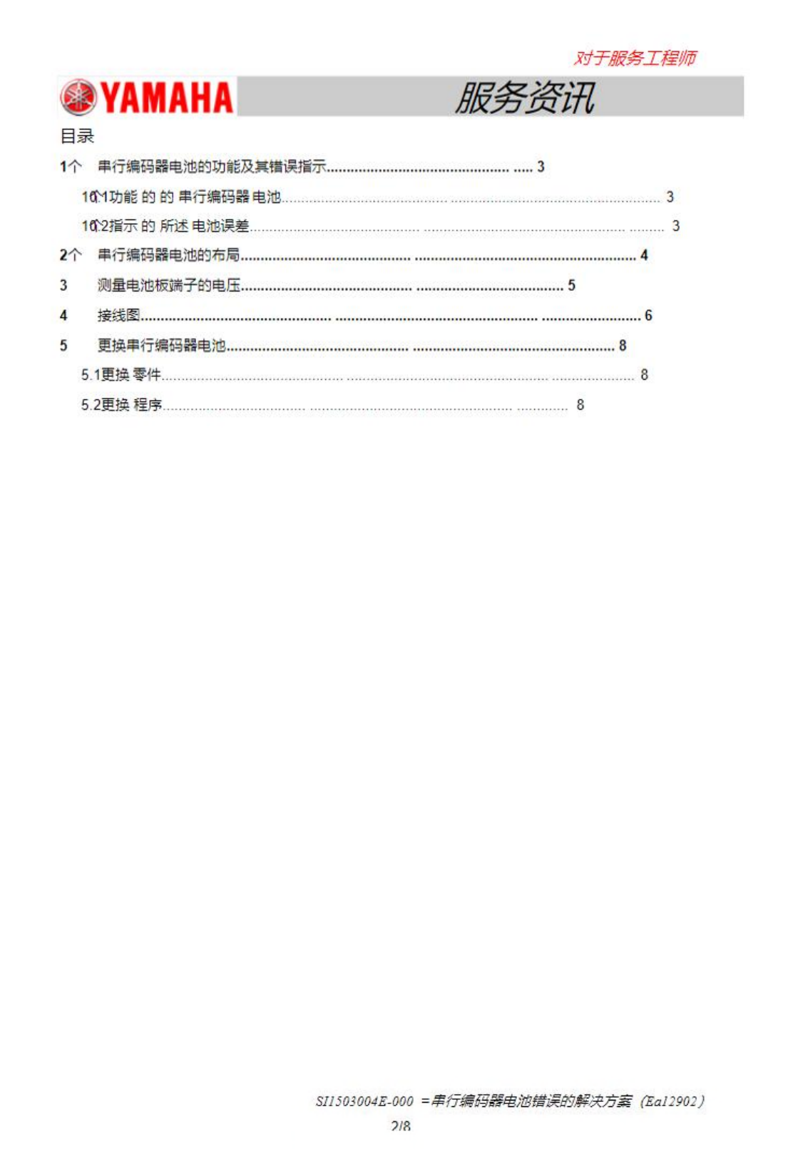 对于服务工 m 师 服务资讯 # YAMAHA 1 个串行編马器电池的功能及其错误指示 1 耵功能的的串行编码器电池 串行锔码器黾池在以下清况下丨己录伺服电机的编码器致琚 ( 当前泣蛋 ) : 机  1 已关闭 , 这消除了机 B 霣斬原虔处理的霈 S 重新启 5 ^ 减少了机薛的启动时间 , E 9 K 当机 II 重 启 现 有 的 八需要从输送叽上卸下木板 。 m 适用的机器型号和电机 I 白 — 个涅电也用于记录单个电机抽的编…