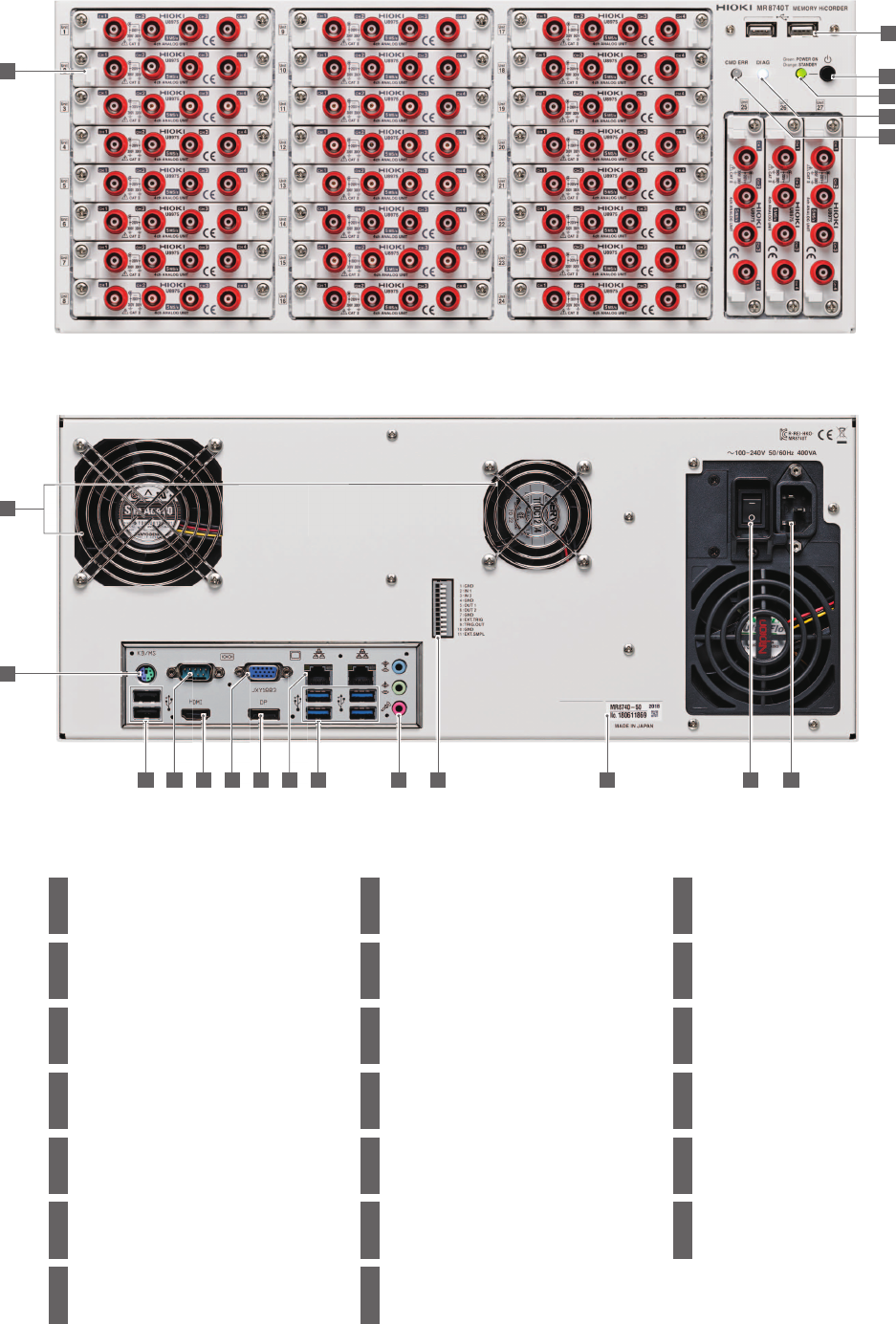 12 前面 背面 2 1 11 13 16 17 19 20 18 12 10 14 3 5 4 6 1 单元安 装部分 可安装单元数最多为 27 个 8973 单元仅插槽 25~27 支持 2 USB 2.0 连接器 × 2 连接 U 盘、 USB 鼠标以及 USB 键盘 3 启动 键 启动本仪器或切换为待机状态 4 POWER 指示灯 显示启动状态或待机状态 5 DIAG 指示灯 显示主机的状态 6 命令 错误指示灯 命令错误时点亮…