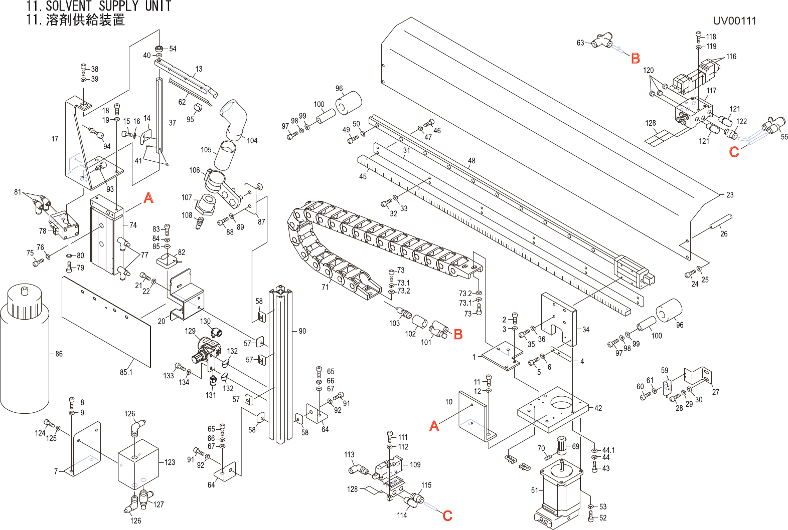 11.SOLVENTSUPPLYUNIT 11 .溶剤供 給装置 UV00111 No. Drg.No.&CodeNo. QTY Description Rating Materials Remarks 番号 図番 &コード 番号 個数 品名 規格 材質 備考 1 PB055Y0 1 BKT BKT FE 2 H5289A 2 BOLT,HEXSOCKET ボ ルト 六角穴 M04X012 FE 3…