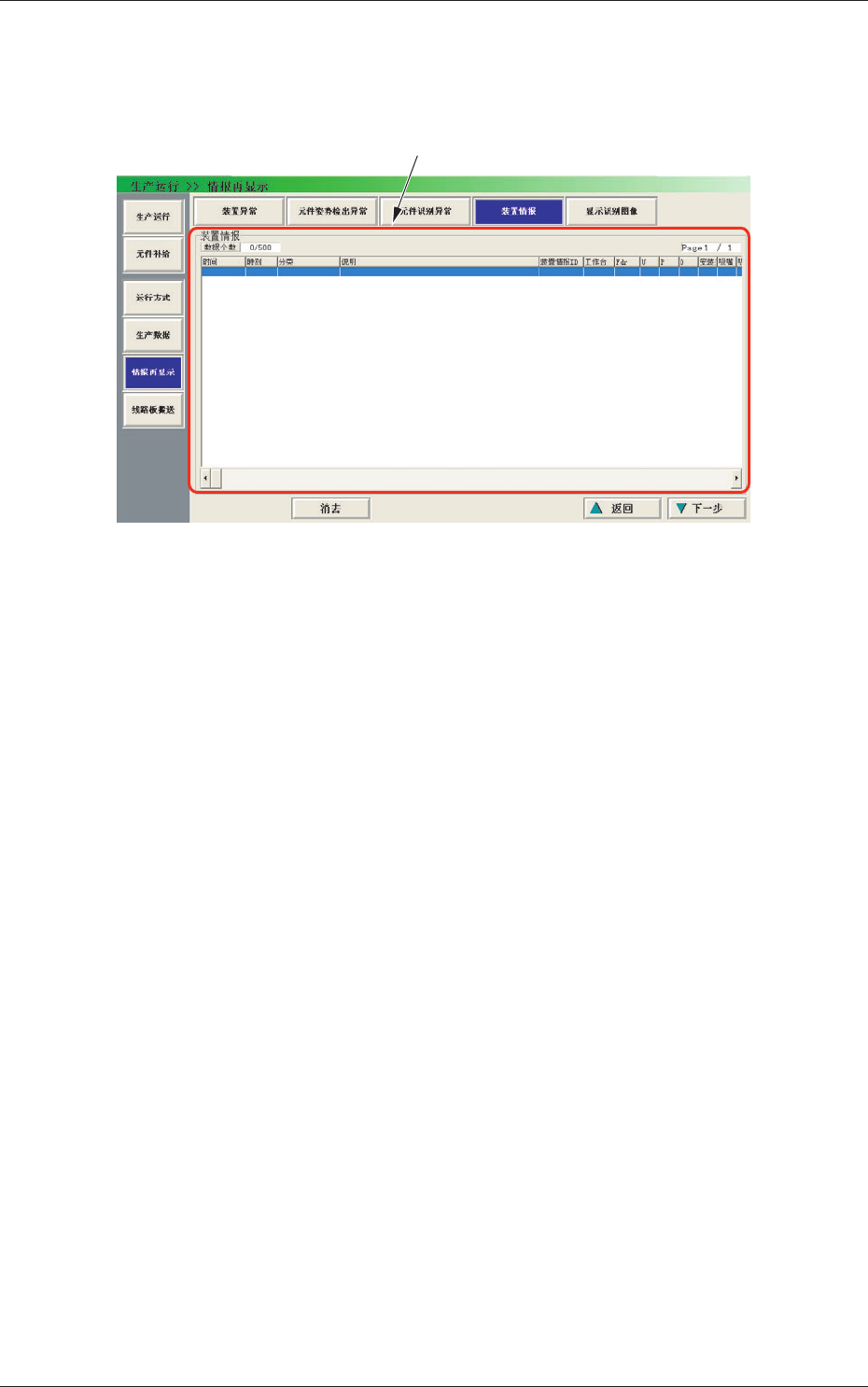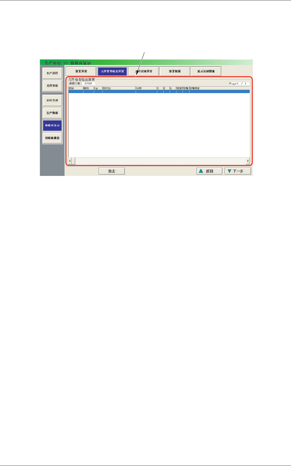 2-54 0710-001 6.3 元件识别异常 6.3 元件识别异常 按 [ 元件识别异常 ] 按钮,便显示 “ 元件识别异常 ” 界面。 Fig.2B36 “ 元件识别异常 ” 界面 [1] 详细显示 最多显示 500 件元件识别异常履历。 超过 500 件,便从最早数据开始删除、更新。 [1] 详细显示