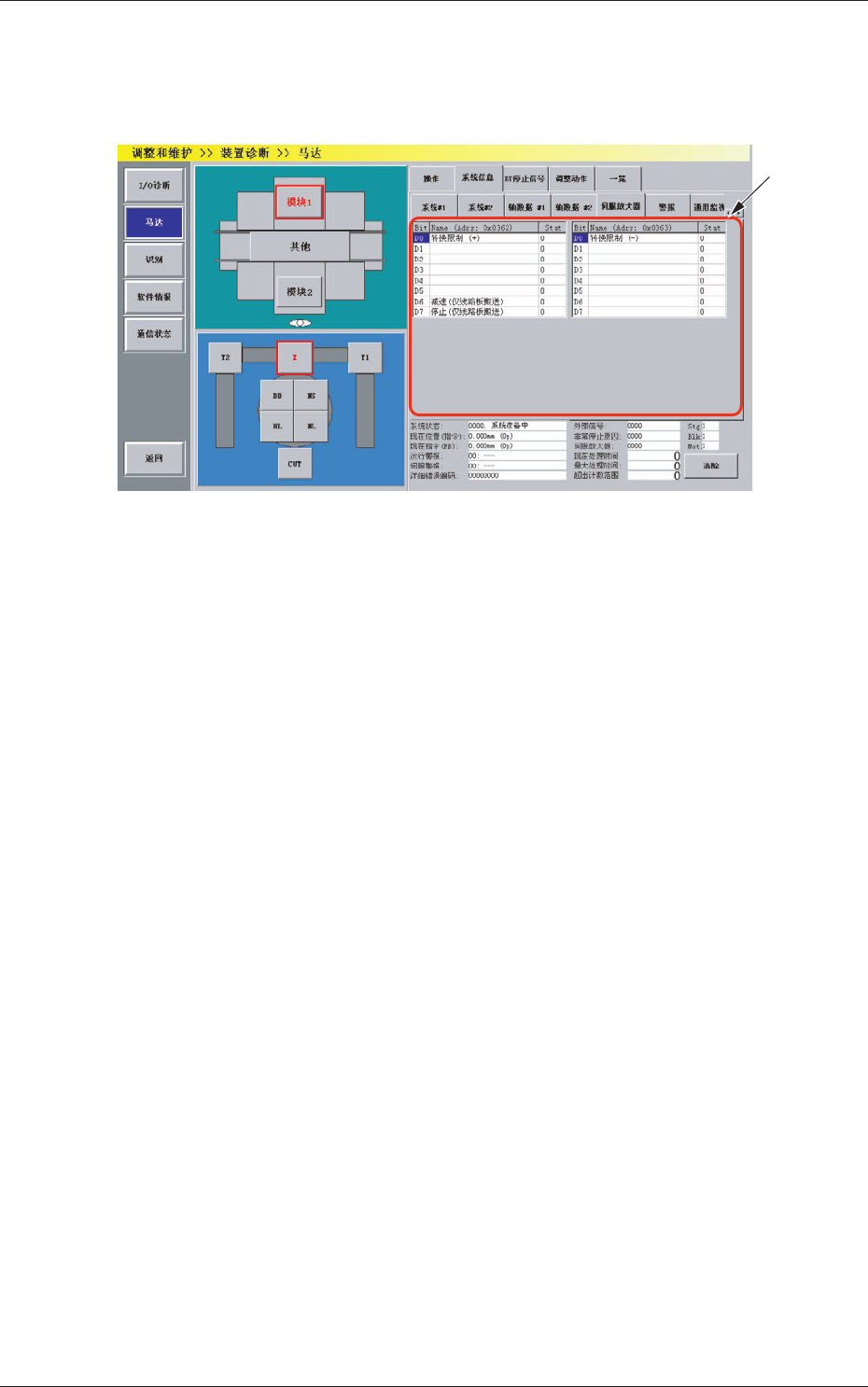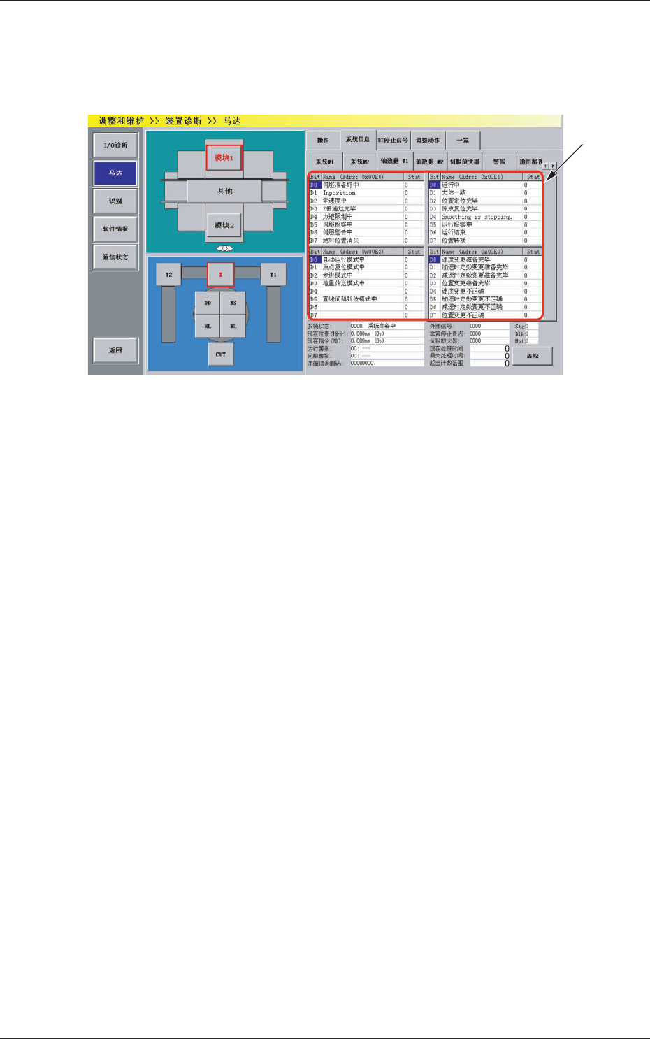4-18 0805-002 3.2 “ 马达 ” 界面 (2) 轴数据 #1、轴数据 #2 在 “ 系统信息 ” 选项卡中,按 [ 轴数据 #1]Tab 或 [ 轴数据 #2]Tab, 便显示 “ 轴数据 #1 ” 选项卡或 “ 轴数据 #2 ” 选项卡。 Fig.2D11 “ 轴数据 #1 ” 选项卡 [1] 状态显示 显示轴数据 #1 或轴数据 #2 的状态。 [1]