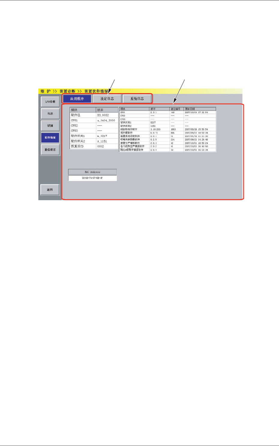 4-24 0805-002 3.4 “ 装置软件情报 ” 界面 3.4 “ 装置软件情报 ” 界面 可以显示装置当前的应用程序情报和设定日志等。 在 “ 装置诊断 ” 子菜单栏中,按 [ 软件情报 ] 按钮,便显示 “ 装置软件 情报 ” 界面。 Fig.2D16-1 “ 装置软件情报 ” 界面 [1] 界面切换按钮 应用程序 显示应用程序情报界面。 设定日志 显示设定日志界面。 系统日志 显示系统日志界面。 [2] “ 装置软件情报 …