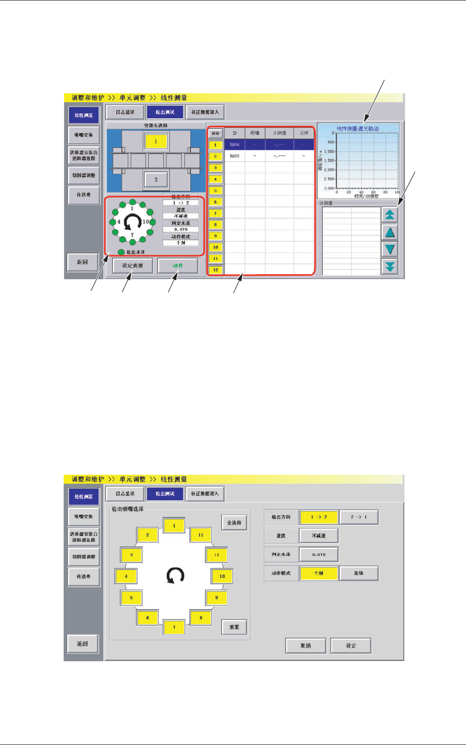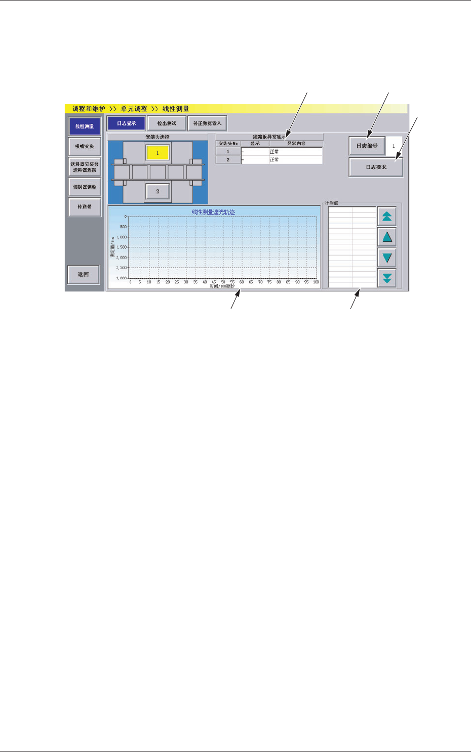 用图表及数值显示装备在各贴装安装头上的线传感器遮光轨迹。