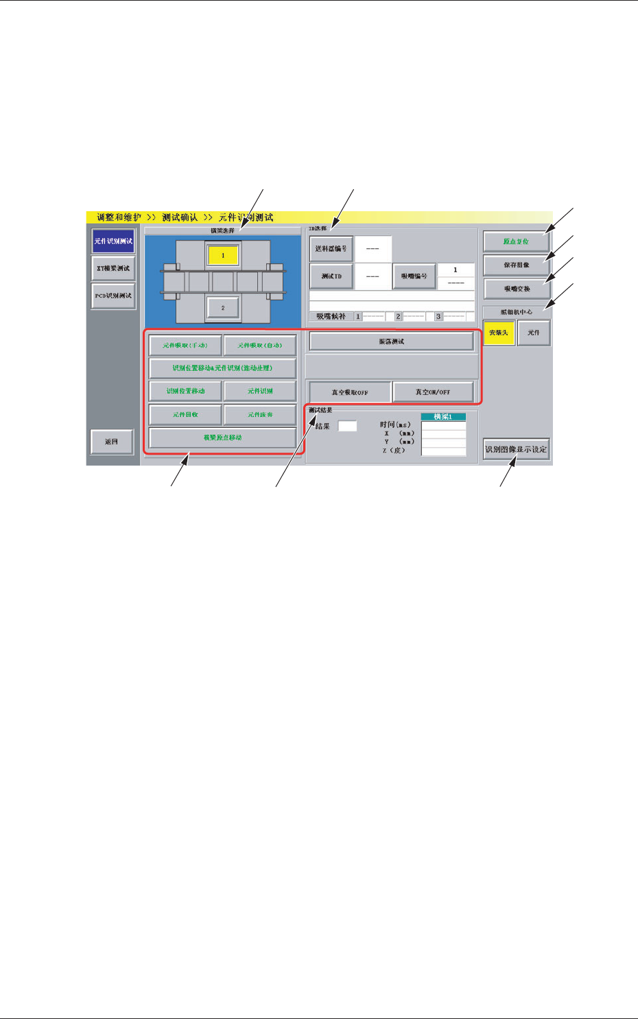 4-49 0805-002 5.1 元件识别测试 [ 吸嘴编号 ] 按钮 设定在识别测试中使用的吸嘴编号。按该按钮,便显示 “ 吸 嘴编号 ” 选择界面。 [3] 操作按钮 [ 元件吸取 ( 手动 )] 按钮 手动贴装元件时使用。 按该按钮后, 在 10 秒钟内再按操作台的 [START] 按钮, 在 [1] 中指定的 XY 横梁的安装头便移动到中央 ( 原点复位 ) 位置, 在 [2] 中指定的吸嘴编号向前侧移动 ( 旋转 )。 [ …