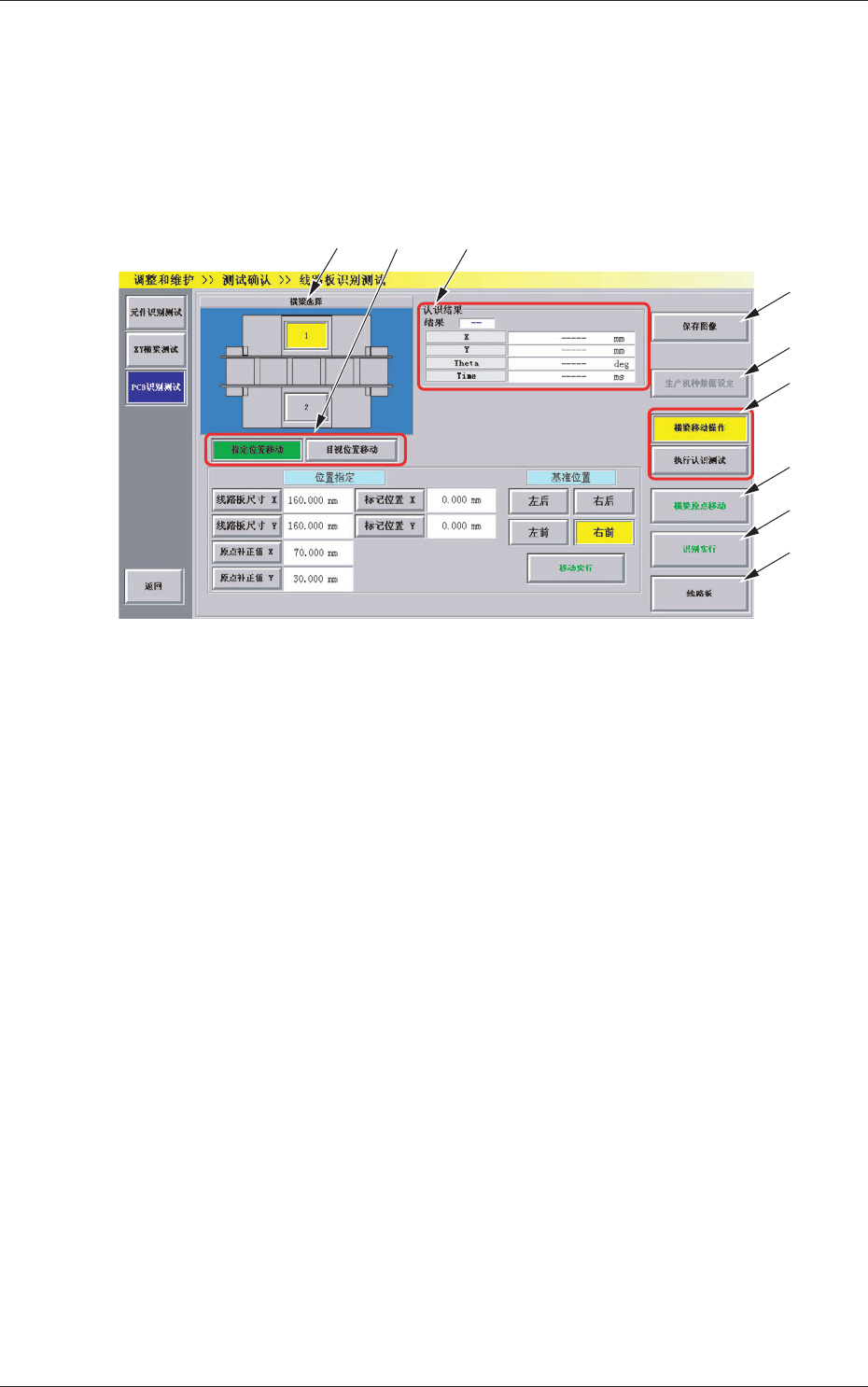 4-69 0710-001 5.3 线路板识别测试 5.3 线路板识别测试 进行线路板识别标记的识别测试。 在 “ 测试确认 ” 子菜单栏中,按 [PCB 识别测试 ] 按钮,便显示 “ 线路 板识别测试 ” 界面。 [2] [7] [8] [4] [3] [5] [6] [1] [9] Fig.2D34 “ 线路板识别测试 ” 界面 [1] 横梁选择按钮 用图像显示表示 XY 横梁的按钮。 选择进行线路板识别测试的横梁。 [2] 认识…