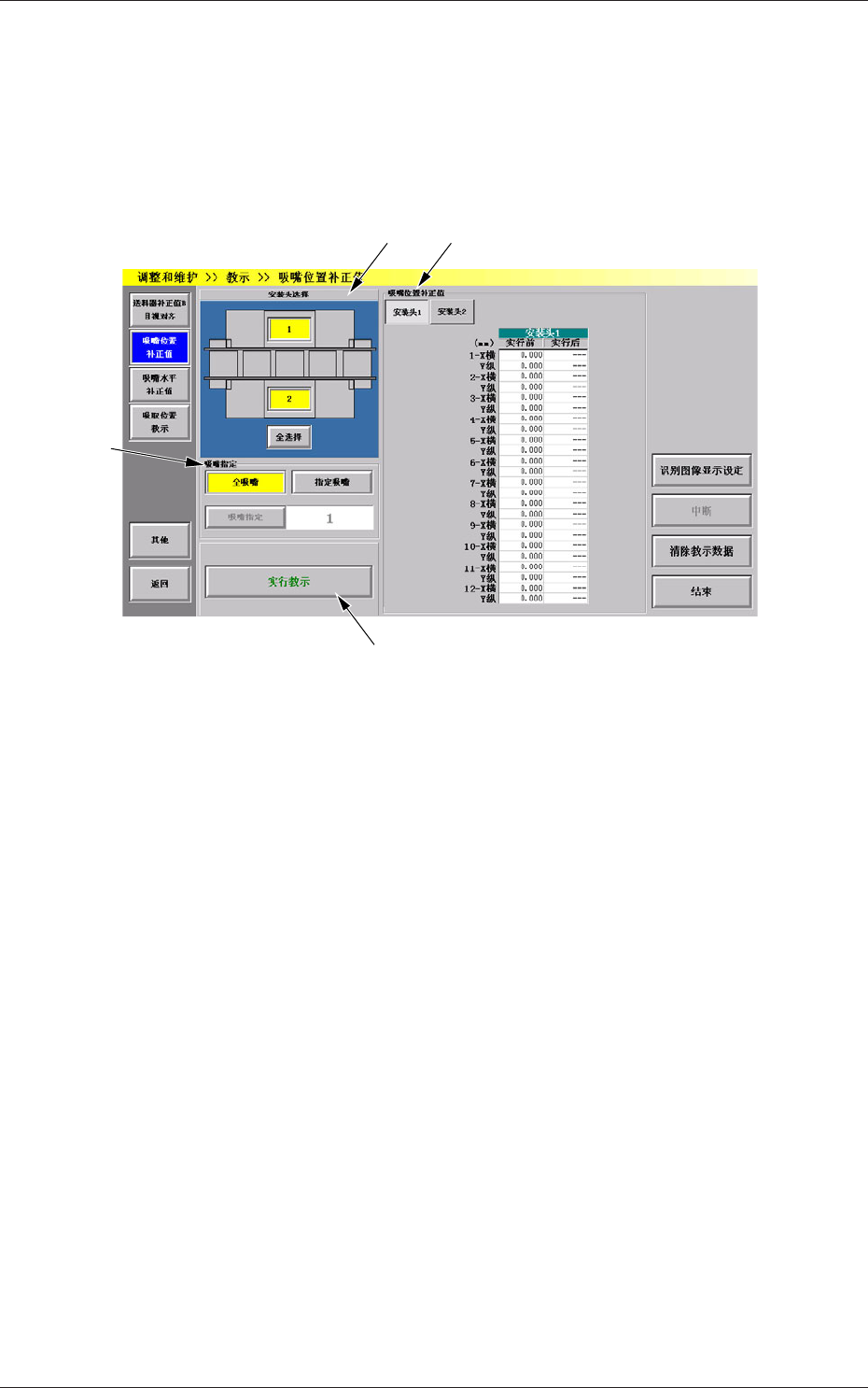 (1) 选择执行吸嘴位置补正值教示的安装头及吸嘴 ( 安装头 1、2、