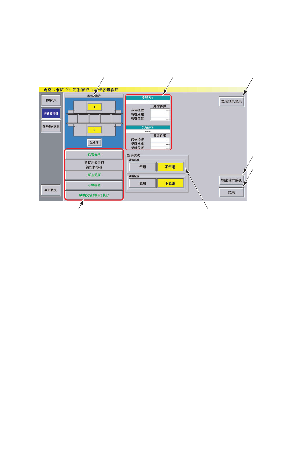 选择进行线传感器清扫的安装头。