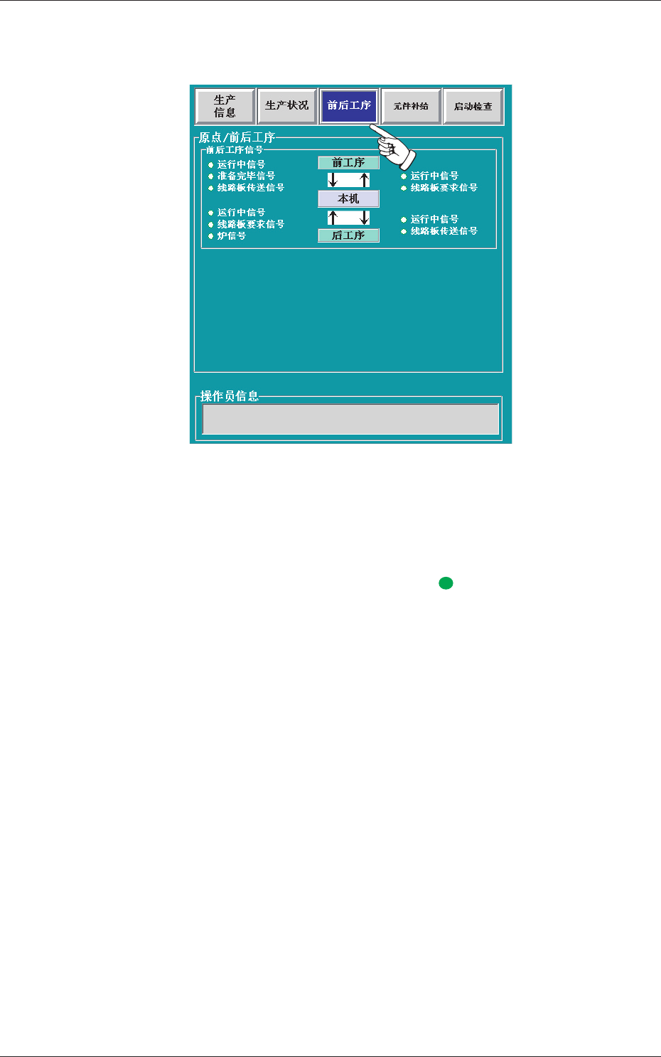 2-8 0710-001 (3) 前后工序 按 [ 前后工序 ] 按钮,便显示原点 / 前后工序进行状况。 Fig.2B3-3 “ 前后工序 ” 界面 原点 / 前后工序 实时显示前后工序信号的状况 (ON/OFF 状态显示 )。 在 ON 状态时,该信号显示被显示为 “ ” ( 绿色 )。 2. 生产运行主要界面