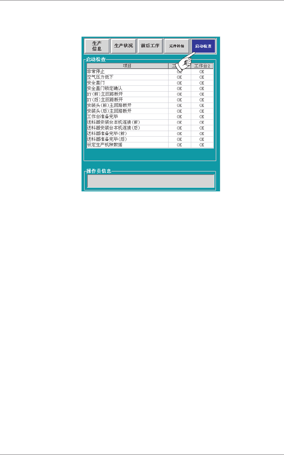 按 [ 启动检查 ] 按钮,便显示各工作台的启动检查信息。