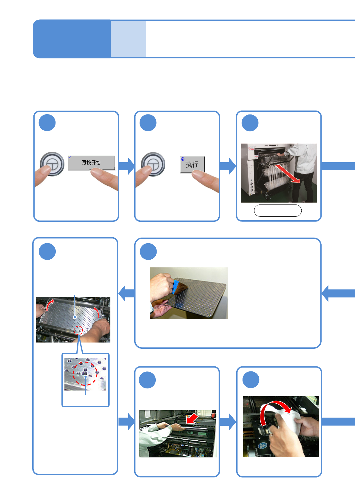●从接近基板支撑块的附近起执行清扫作业。在后侧存在托盘料架的设备上,则从前侧开始作业。