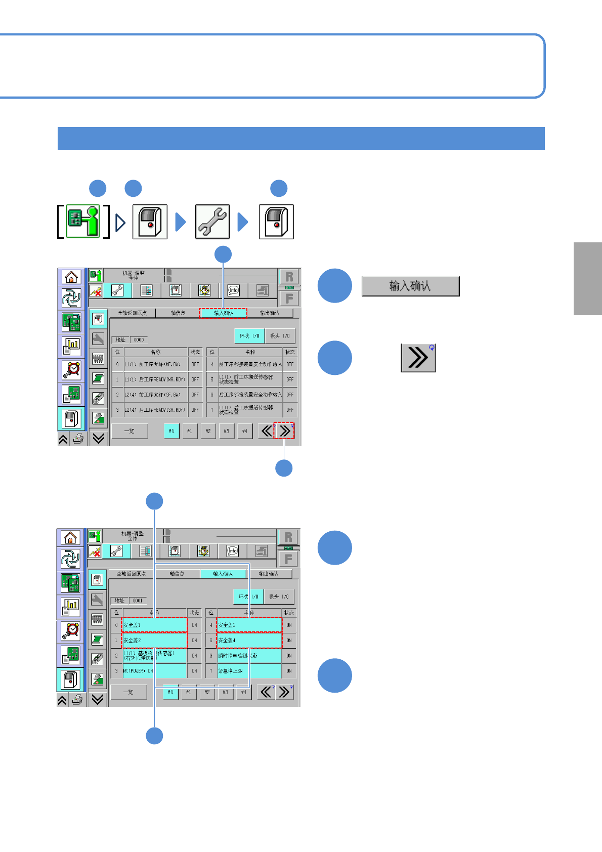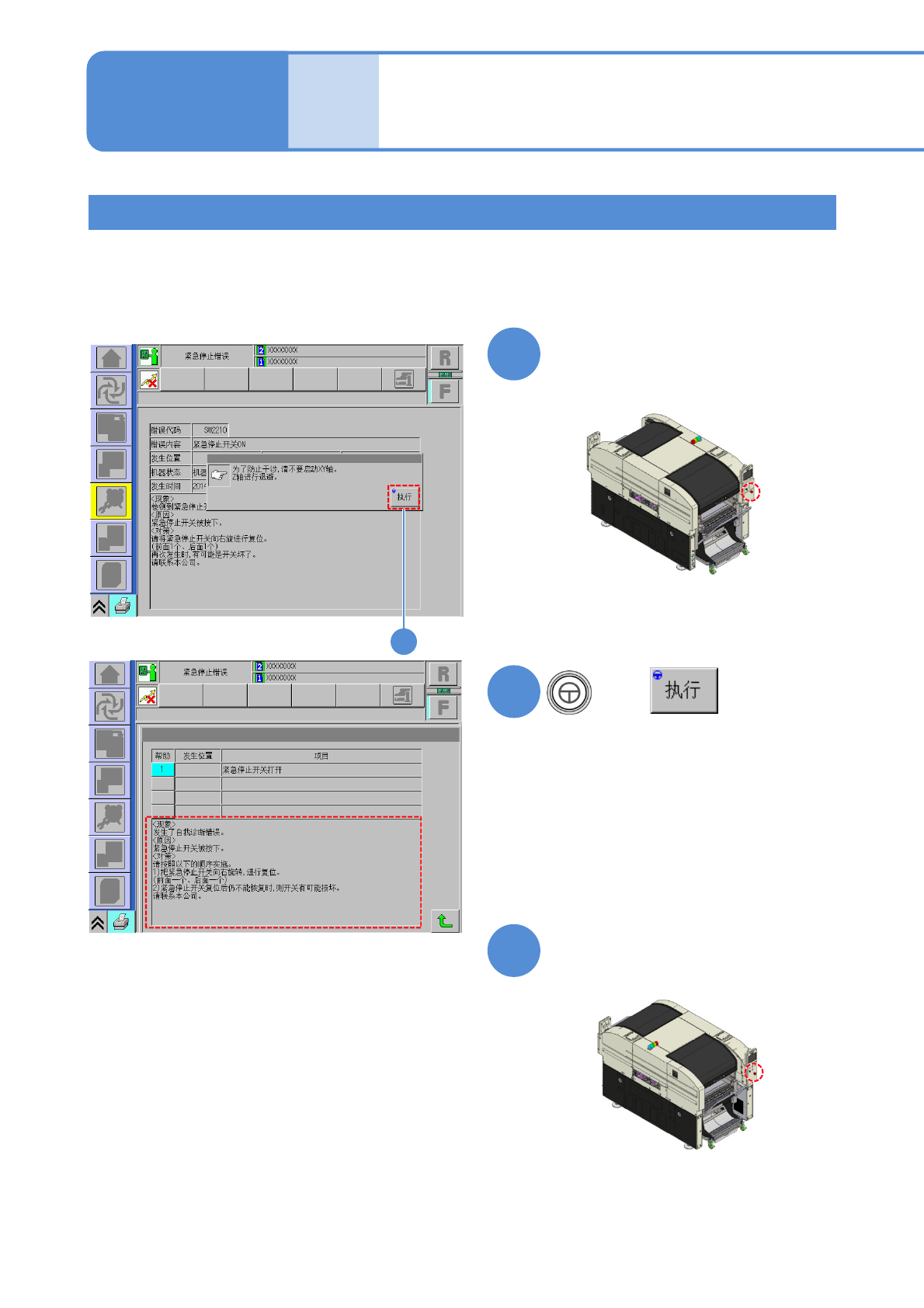 NPM-W 2 EJM7DC-MB-06M-0 0 对紧急停止开关的检查方法进行说明 。 使用工具 : 不要 所需时间 :2 分钟 ● 请事先执行原点复归操作。 安全开关的检查 6-8 -1 维修保养篇 6-8 紧急停止开关的检查 1 3 2 2 按前侧的紧急停止开关。 按后侧的紧急停止开关,并确认画面 与前侧相同地过渡到新画面。 请确认画面已经过渡到左侧画面。 请确认画面已经过渡到左侧画面。 +