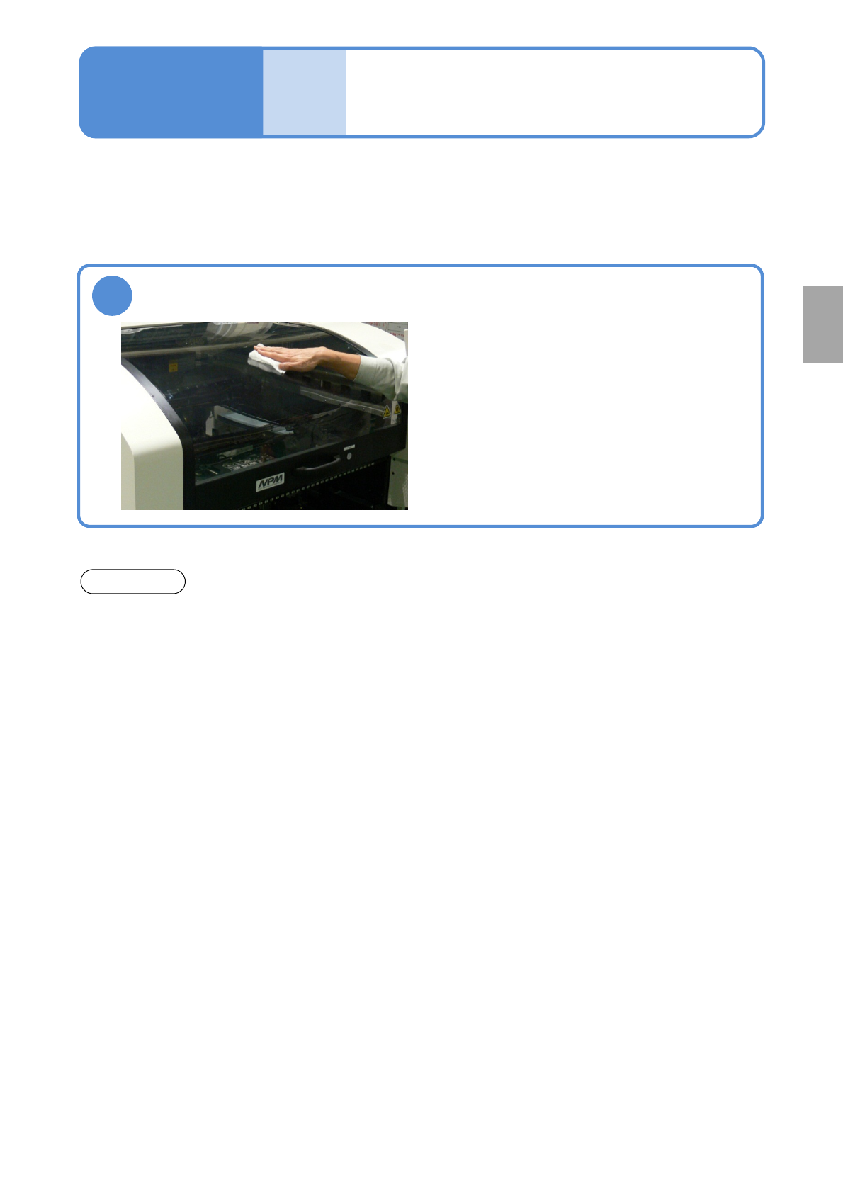 NPM-W 2 EJM7DC-MB-06M-0 0 安全盖的清扫 对安全盖的清扫方法进行说明。 使用工具 : 棉纱布、 中性洗涤剂 所 需时间 :5 分钟 ●安全盖不限定每月 1 次,有灰尘等污垢时请随时清 扫。 1 清扫安全盖 ●因为安全盖容易受损伤,请注意磨 损或划痕。 ●请勿使用酒精、稀料、各种清洁剂 ( 溶剂 ) 等中性洗涤剂的 原液进行清扫。 ( 是造成裂纹或者致使防电效果急剧降低的原因 ) 注意 6-15 ●有不易除去的灰尘…