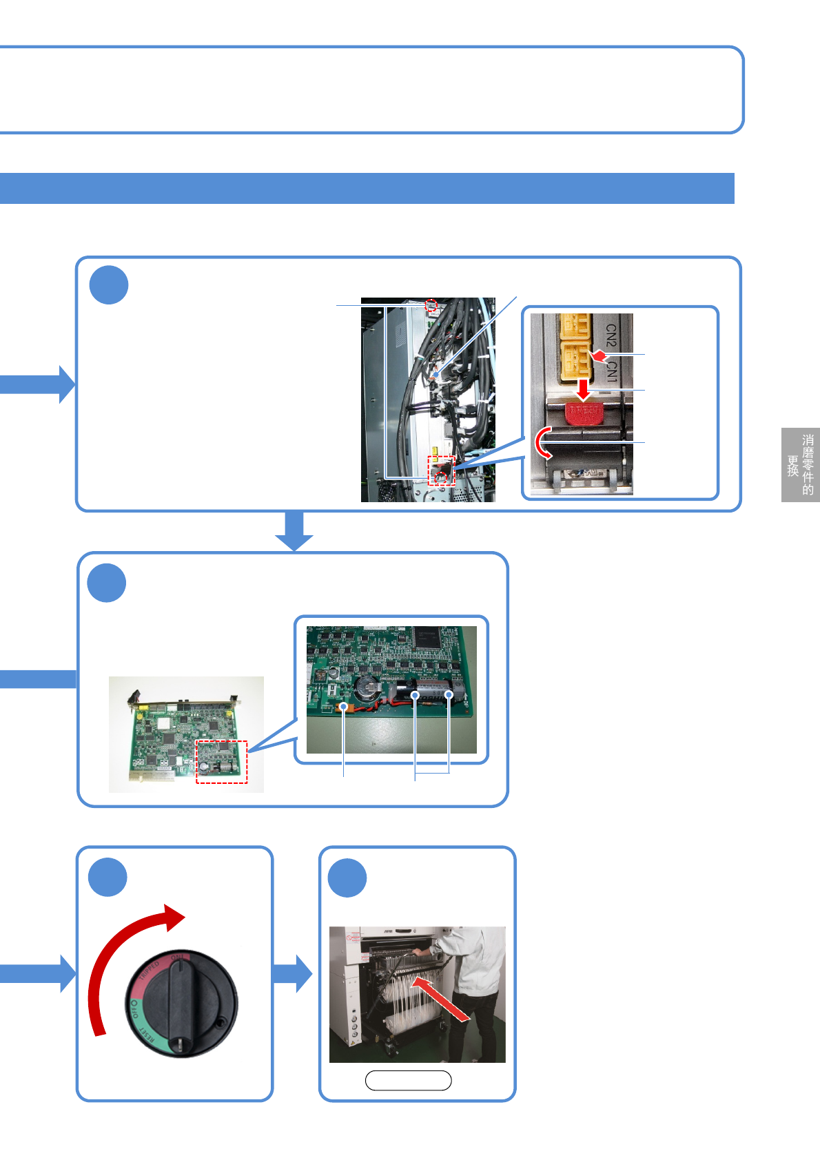 NPM-W 2 EJM7DC-MB-12M-0 0 NCIO 板 4 ●卸下电缆。 ●卸下固定 NCIO 板的螺丝。 ●按下板下部杆的按钮 (PRESS) ,同时往下推杆, 拉出 NCIO 板。 卸下 NCIO 板 12-3 -6 安装交换台车 ( → P.3-2) 10 螺丝 (2 个 ) 9 5 卸下蓄电池盒 ●卸下连接器。 ●切断捆扎线 (2 处 ) 。 捆扎线 连接器 按下按钮 往下 推杆 拉出板 解锁 ON 前侧