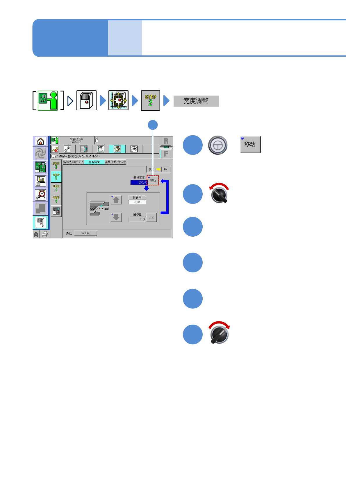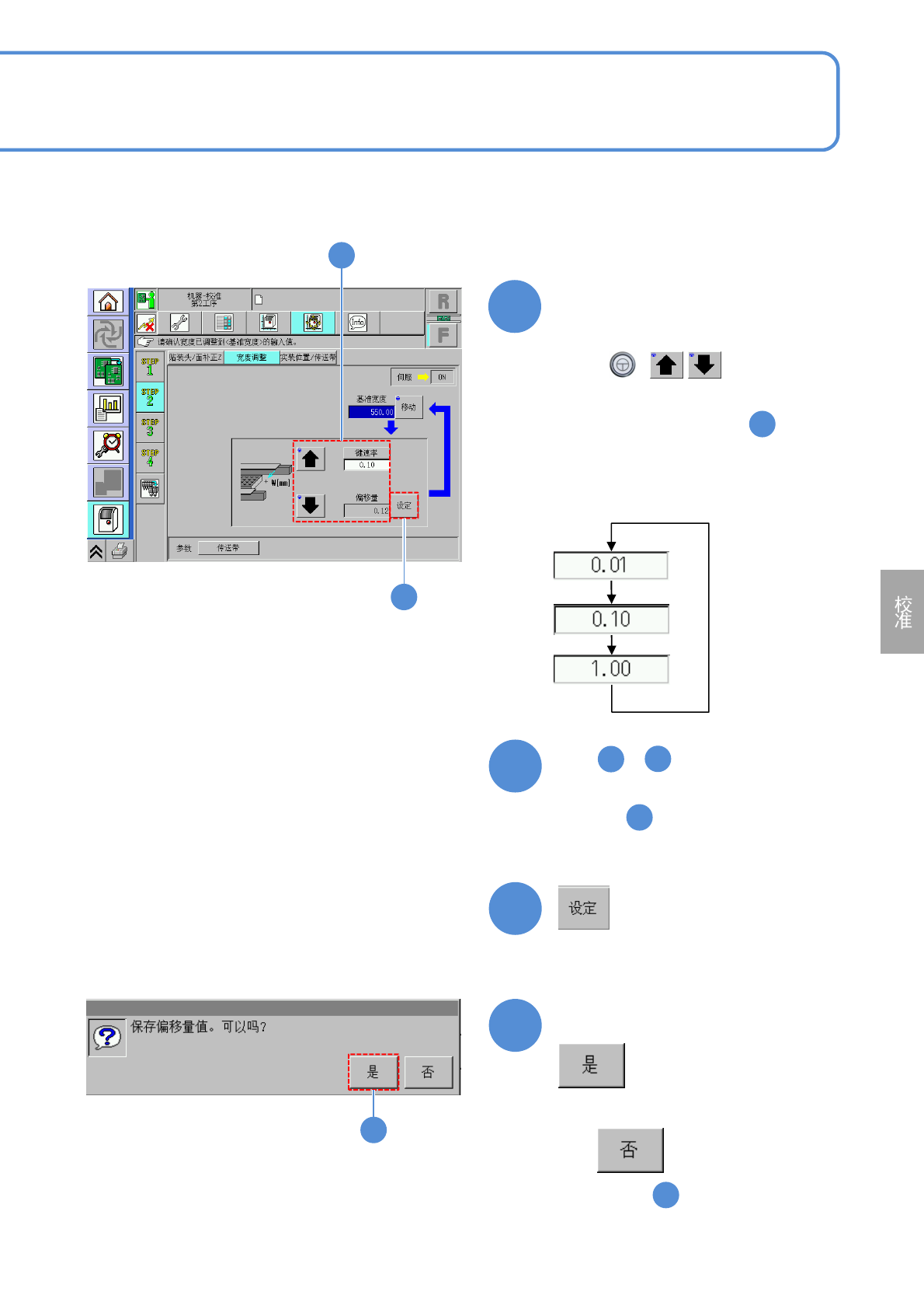 NPM-W 2 EJM7DC-MB-13M-00 9 重复 ~ 的操作 , 使宽度达到基准宽度 8 10 ( 偏移值被设定 ) 2 7 ■不保存偏移值时 ( 仍然是 的画面 ) 9 确认提示 7 调整传送带的宽度 10 13-5 -2 9 7 ●按 [ 键速率 ] ,可以变更移动量 。 ①通 过 [ 键速率 ] 设定动作量。 ② 通过 移动传送带。 4 + ●把“偏移量”调整为步骤 的测 定值和 550.6 mm 的差分的数值。 ( 在…