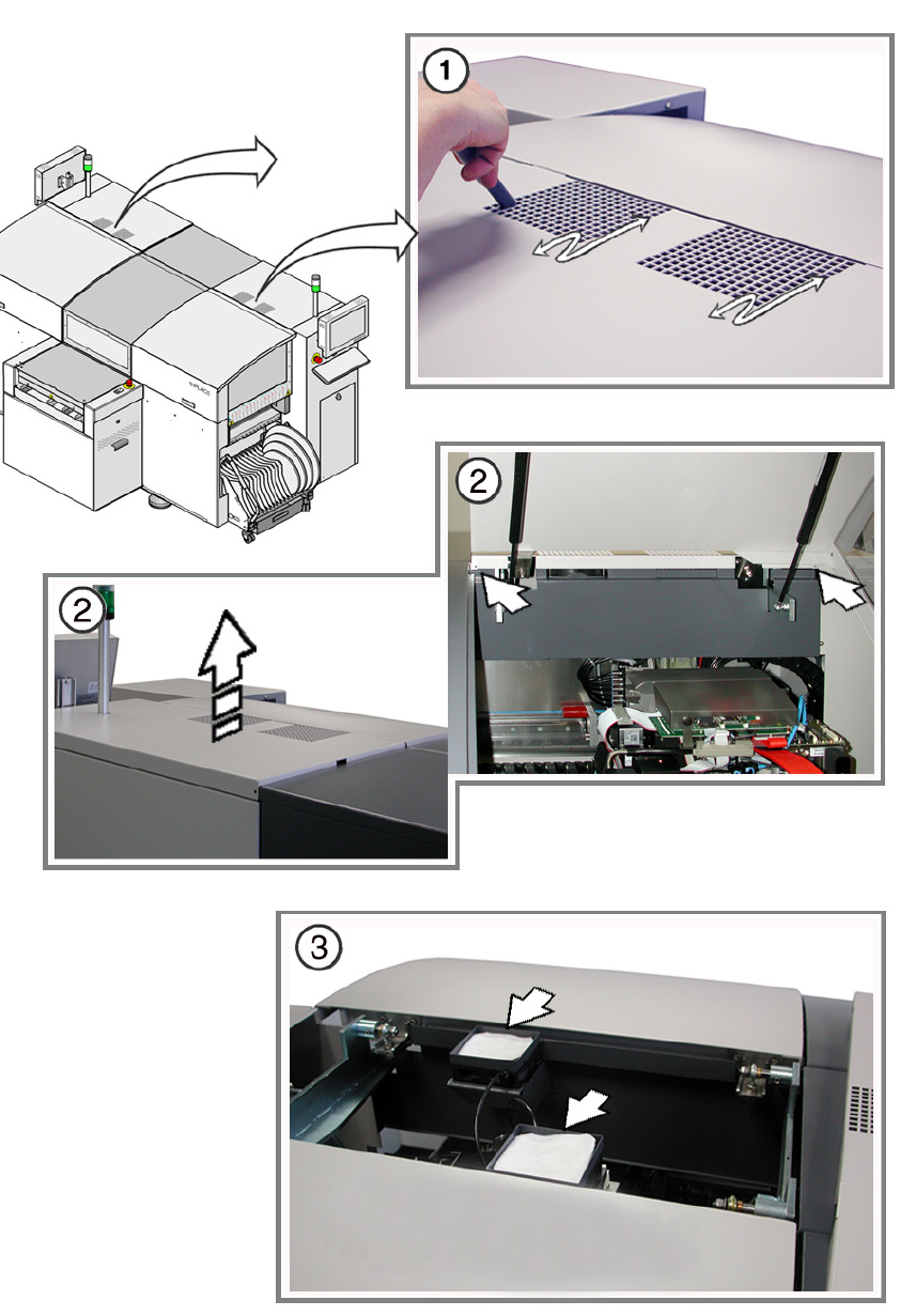 ① 用吸尘器清洁 Y 轴冷却的过滤器垫 (4 个过滤器垫,贴片机每侧两个)
