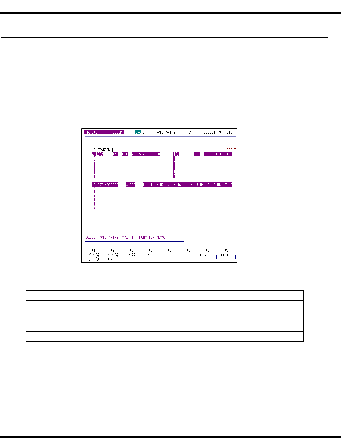 <F2: SEQ MEMORY>、<F3: NC> 和 <F4: RECOG> 是仅供维修工程师使用的功能。