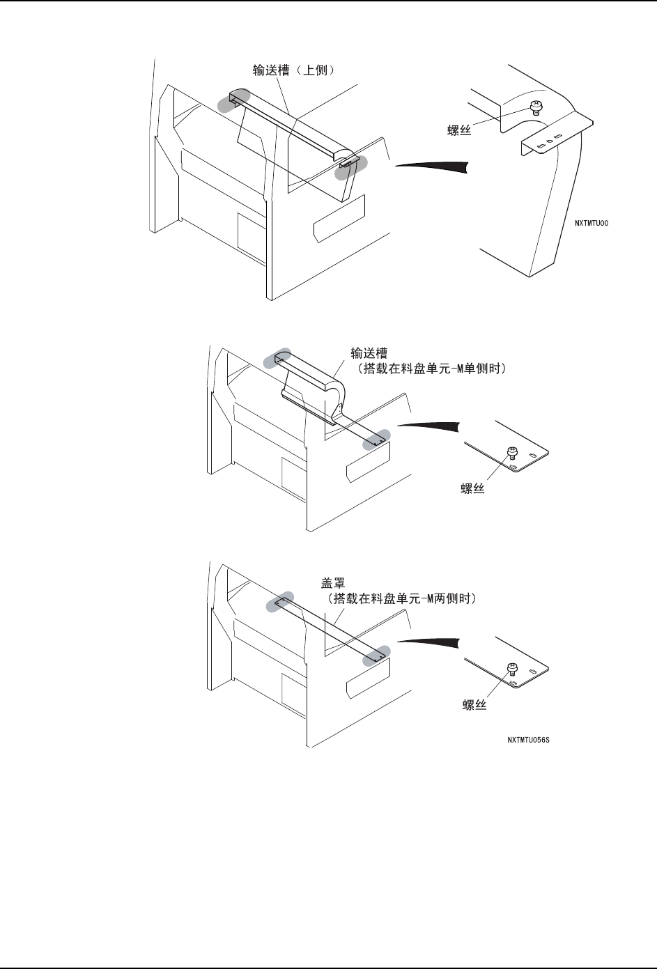 2. 使用拆除的螺丝,安装与料盘单元 -M 相对应的输送槽或者盖罩。