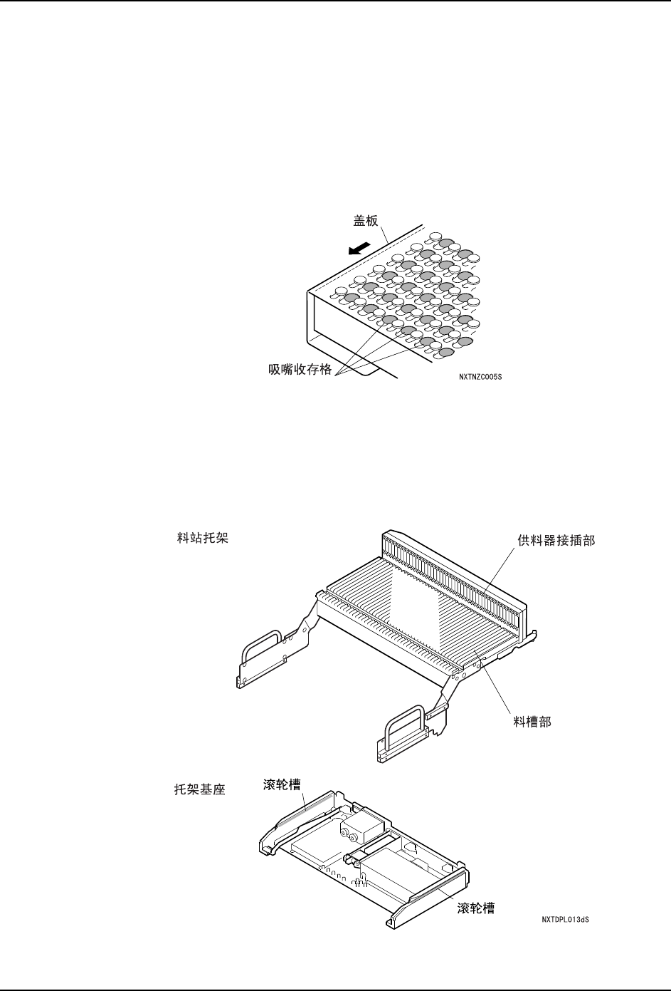 6. 预防保养 QD145-13 204 NXT II 机械手册 6.4 每周 (160 小时 ) 的操作 6.4.1 吸嘴更换器的清扫 1. 拉 出模组。 (参考 「5.1 模组 的拉出 / 插入」 ) 2. 拆除吸嘴置放台。 (详细请参考 「5.9 吸嘴置放台的拆除 / 安装」 。) 3. 移开盖板取出所有吸嘴。 4. 使用吸尘器吸取残留在格内的垃圾及异物 。 6.4.2 料站托架的清扫 1. 取出料站托架。( 详细请参考 「5.3…