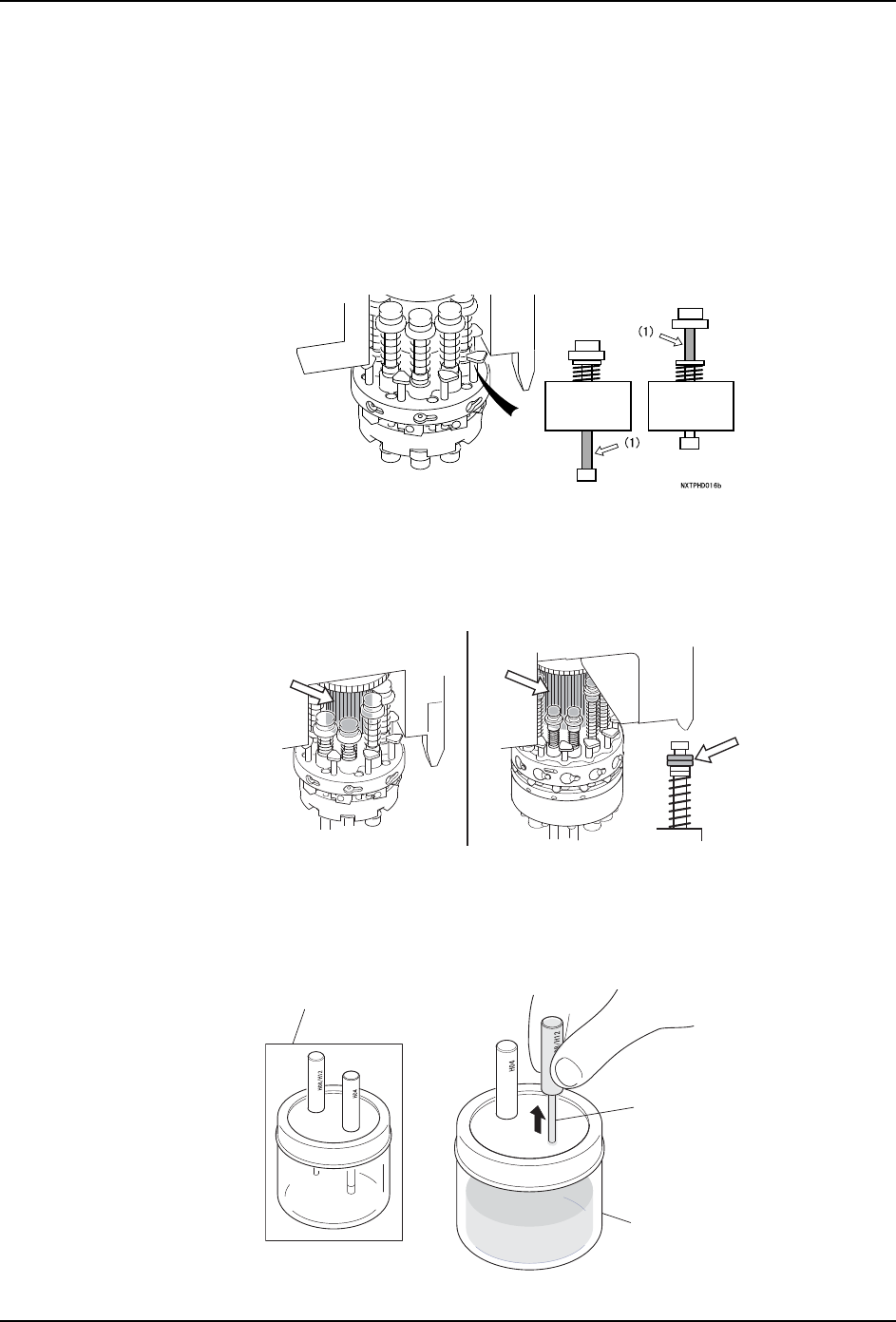 6. 预防保养 QD145-13 228 NXT II 机械手册 c. 把在注油棒前端粘附的多余的润滑油用清 洁布擦去。 d. 请在升降杆内插入注油棒。 请大约插入到注油棒上刻的槽为止。 此后, 轻轻地旋转使 润滑油均匀地涂敷在 O 型圈上。 备注 )在升降杆的前端粘附有润滑油的时候,请用清洁布擦去。 e. 请反复将注油棒返回密封瓶中再次沾敷润 滑油后,向各个升降杆内涂敷。 使用润滑油涂敷用治具时的注意 事项 1. 在注油棒的插入口周围…