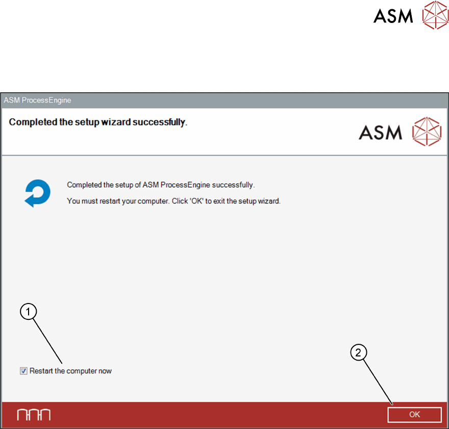 4 Installation 4.2 Installing ASM ProcessEngine Installation Guide ASM ProcessEngine 2.0 (Pre-Placement) (R18-1) 10/2018 21 4.2.1 Restarting the Computer If a restart of the computer is required after the Setup Wizard ha…