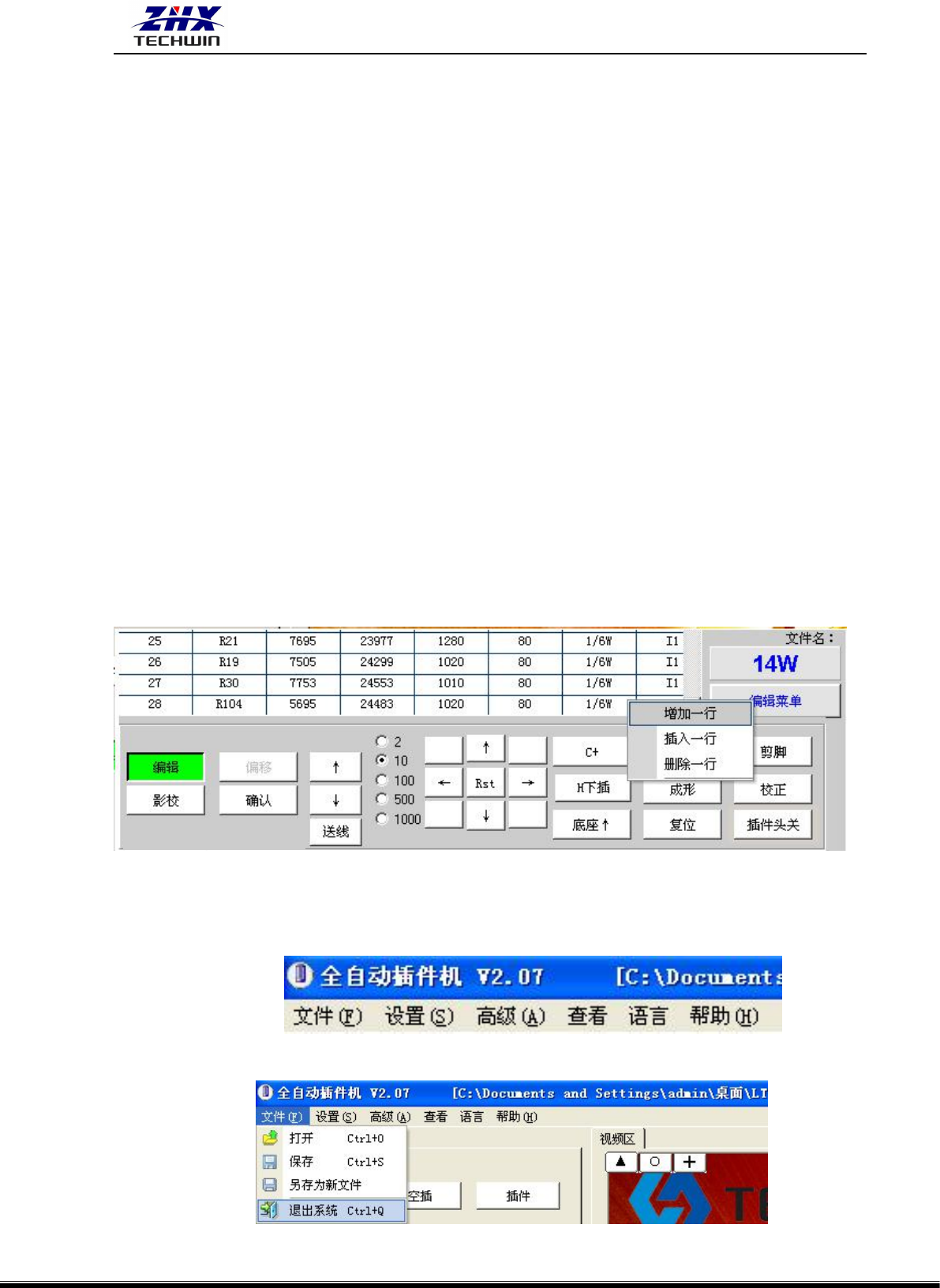 ZHX-A30-A S/-IN 自动卧式联 体插件机操作 说明书 深圳市中禾 旭精密机械有 限公司 http:// www .z kdip.com - 11 - 保存程序: 将生产程序保存到指定的文件夹。 保存图像: 将视频图像保存到指定的文件夹。 退出: 退出生产菜单 ,返回上一级操作 系统。 2 )设置 单击设置弹出下拉菜单。包括有设备参数、元件参数、修改密码三个部分。 (如下图) (1) 设备参数 (如图) : 机器的所有 参数调…