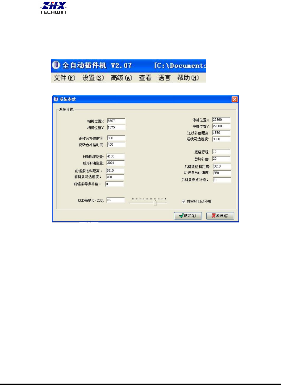 送线补偿、转台补尝正转 和反转、底座行程值、剪脚时间值、停机位置 X(Y)、光源亮度调节等。