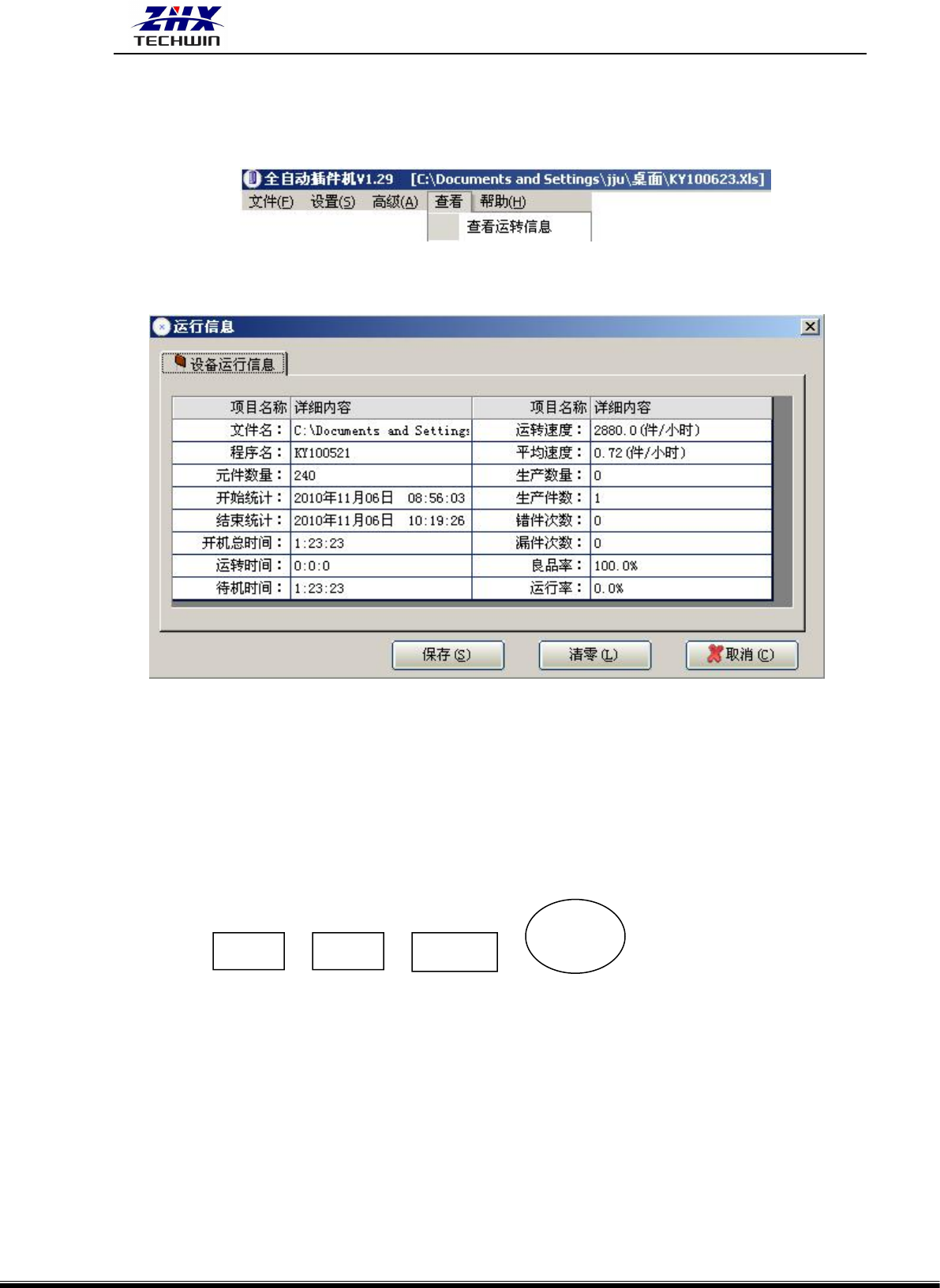 ZHX-A30-A S/-IN 自动卧式联 体插件机操作 说明书 深圳市中禾 旭精密机械有 限公司 http:// www .z kdip.com - 15 - 按数字站号检测对应的分配头下料正常与否,对应的电磁阀及气缸控制分配头。 4) 查看 当前生产的程序信息和运转信息。 选择合适的信息, 则会动弹出所选择的信 息窗 口进行统计 查看运 转信息 :包括 产量, 待机时 间,插 件时间 等信息 ,可将 它自动 保存到 D 盘“ 自动插…