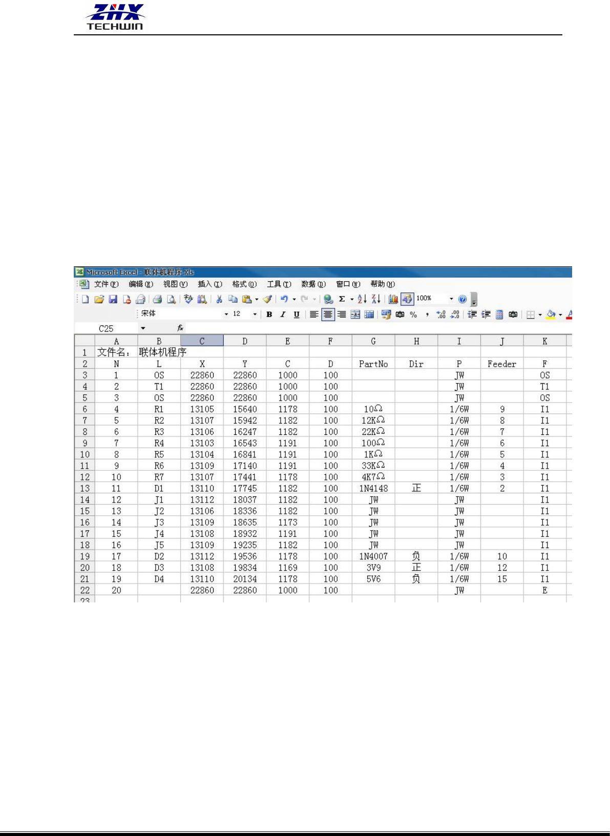 ZHX-A30-A S/-IN 自动卧式联 体插件机操作 说明书 深圳市中禾 旭精密机械有 限公司 http:// www .z kdip.com - 18 - PartNo : 程序的第二行第七列,元件的规格。 Dir: 程序的第二行第八列,有极性(即二极管)元件的正负方向。 P: 程序的第二行第九列, 元件参数列, 是告诉机器要执行插 入跳线还是插入元件, 以及控制 H 轴的插入深度(调整元件的松紧度) 。 Feeder : 程序的…