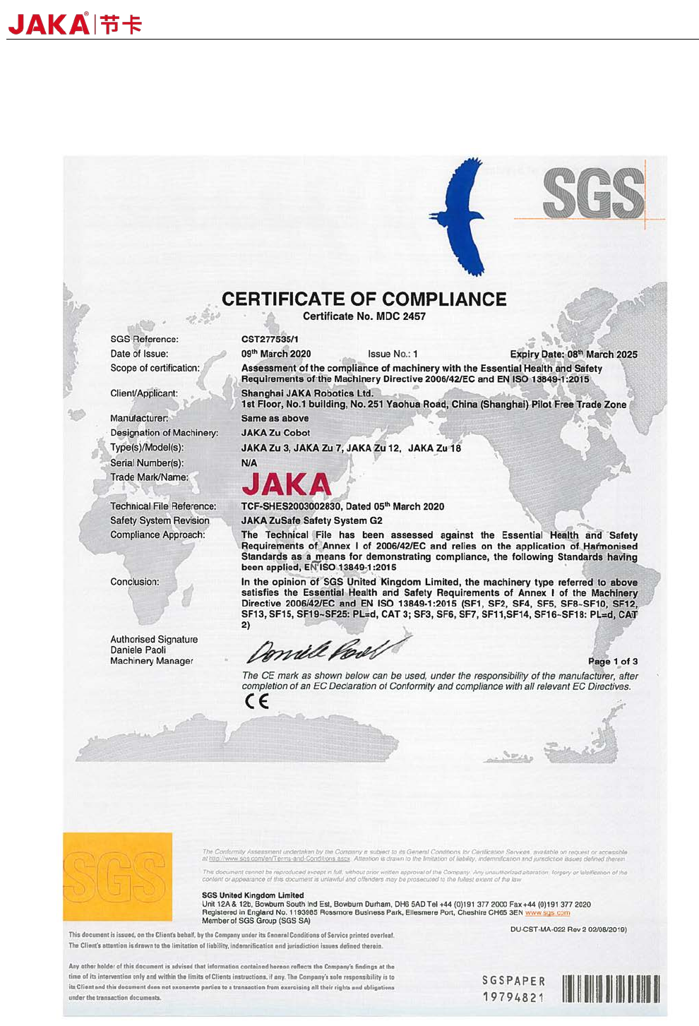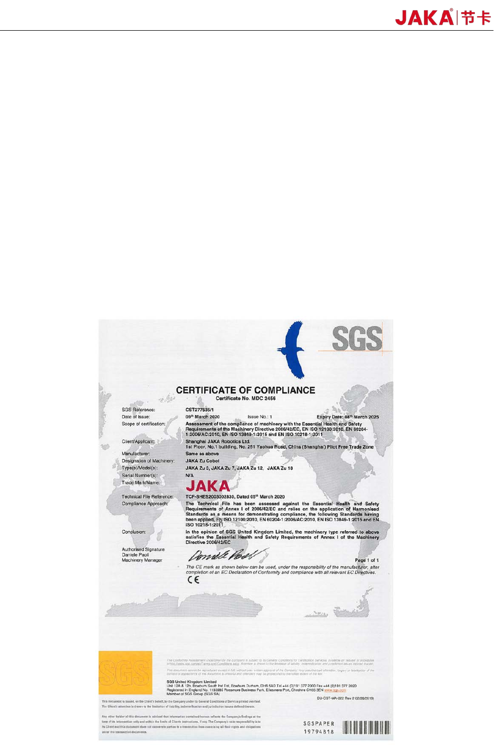 JAKA Zu 12 v 1.0 45 《 Machinery Directiv e 2006/42/ EC 》 《 EN ISO 13 849 - 1:2015 S afety of mach inery -- S afety - r elated parts of contro l systems - Part 1: Ge neral principles f or desi gn 》