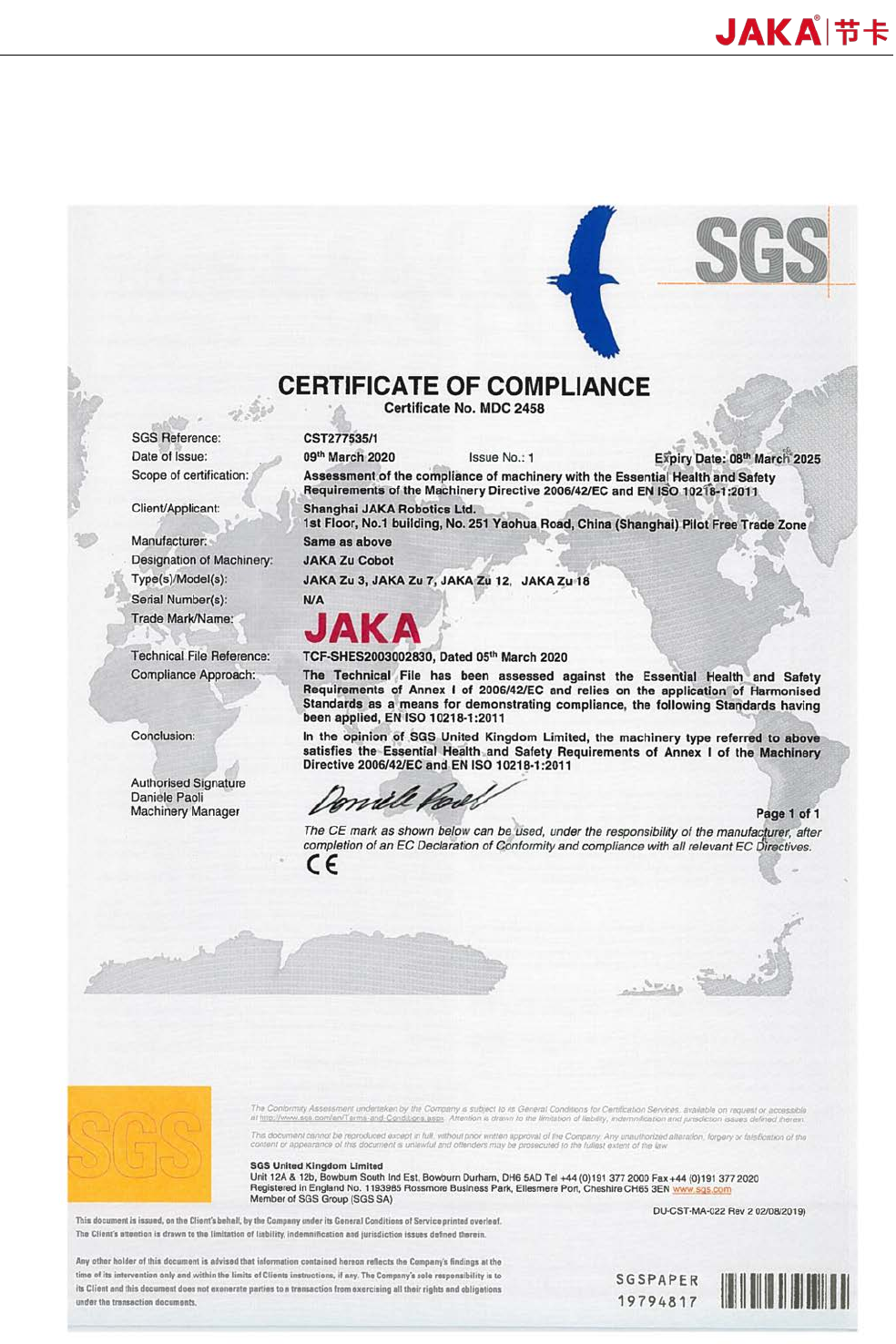 The company's product JAKAZu 12 robot, through the EU CE MD (machine safety) directive, meets the
