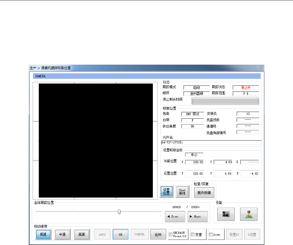 操作手册 2- 20 2-4-3- 10 吸取跟踪 启动吸取跟踪画 面。 详见 JM -100 使用说明书 「第 4 章 制作生产 程序 」 的「 4-5-6-4 贴片位置」 以及 「 4-5-6-6 吸取位置 / 吸取高度」 。 ・ 吸取跟踪
