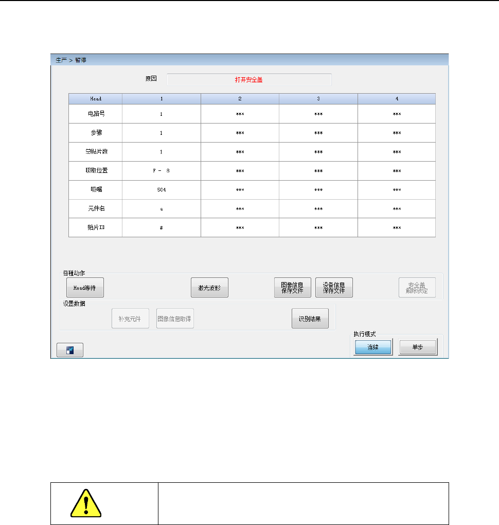 在生产动作中如果供料器台架下降,生产将暂停,显示暂停画面。