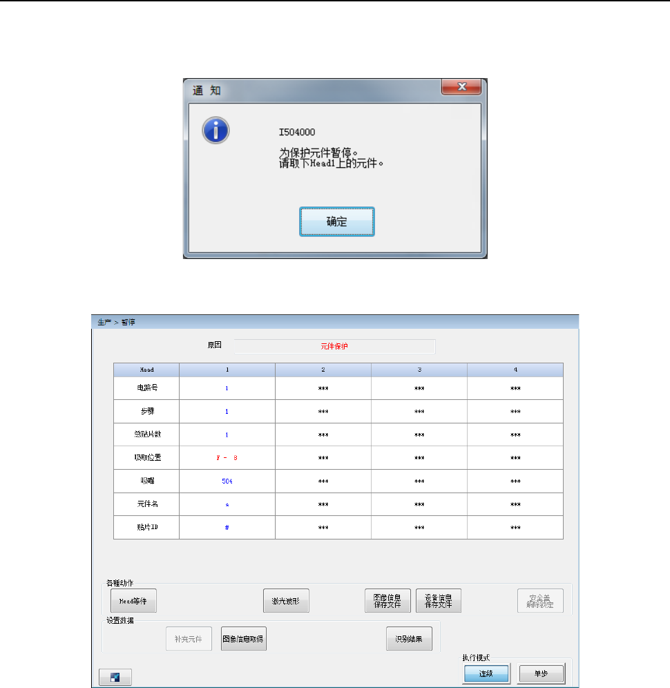 到元件保护位置后,显示通知画面,暂停生产。
