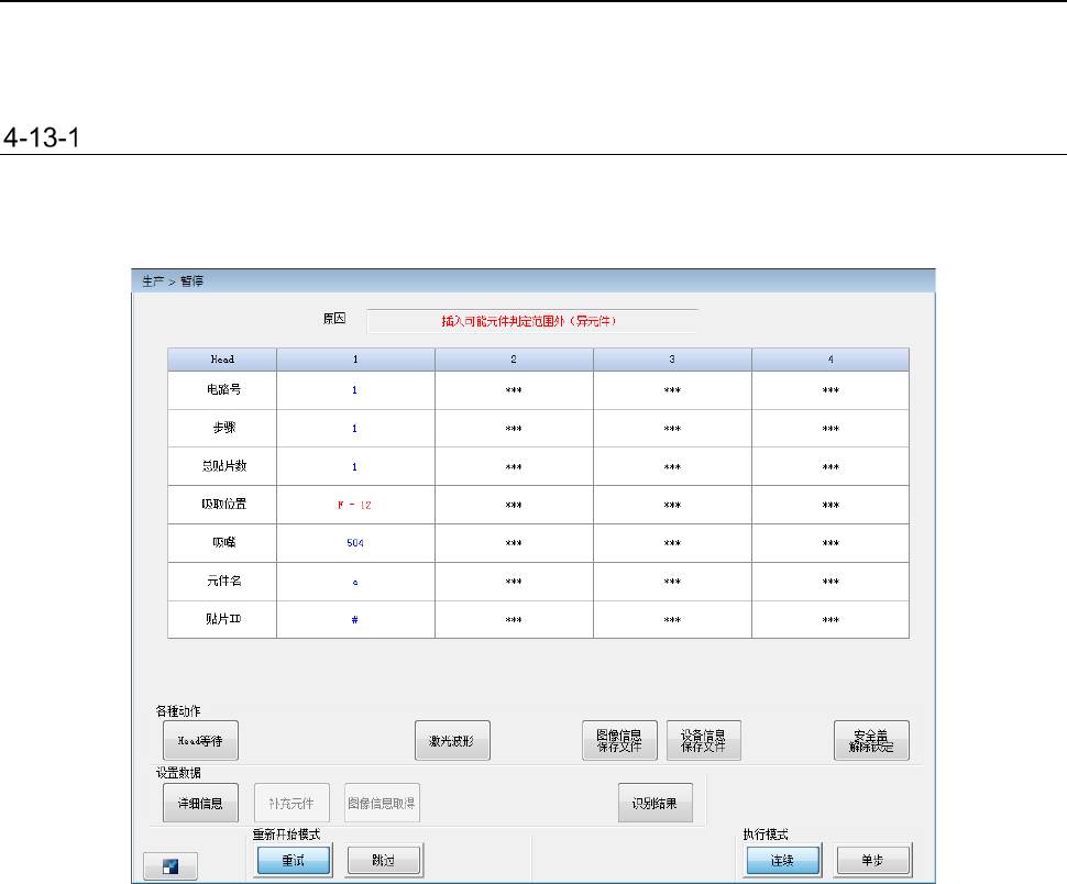操作手册 4- 19 4- 12 引脚(管脚)的 长度不同 ( 元件用尽 ) 在操作选项 – 生产 – 暂停 中勾 选 了「 发生错误时暂停」 时, 如果发生生 产 中引脚 长度 不同 ( 元件用 尽 ) 的情况, 则 停止生 产并显示暂停 画面。 元件种类为插入 元件的 INS 电解电容器时 ,其激光高度为 距元件的引脚 下面 1mm 。误将 元件高度设 定的过大时,激 光高度会无法照 射到引脚位置 。 在该状态下生产 动作吸取元件,…