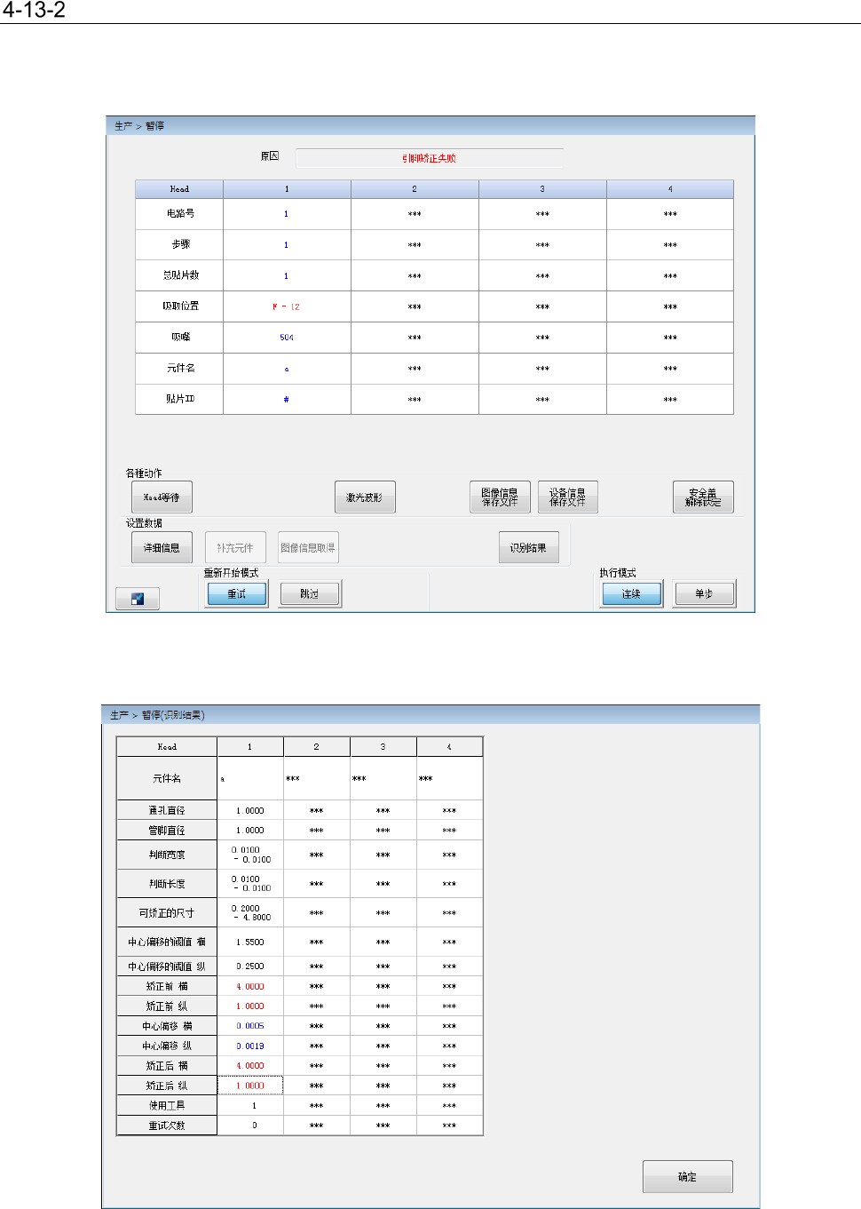 操作手册 4- 23 (1) 清单 显示 引脚的 识别信息。未 测量的贴片头项目显 示「 *** 」。 如 果「 矫正前 横 」 、「 矫正前 纵 」 、 「中心偏移 横」 、 「中心偏移 纵 」 、「 矫正后 横 」 、「 矫正 后 纵」的测量 结果在各判定尺 寸范围内则显 示蓝色,如果在 判定尺寸范 围外 则显示红色。 项目 内容 贴片头名 显示测量后的贴 片头。 元件名 显示 元件 的元件名。 通孔直径 显示对元件所设 定的通孔直…
