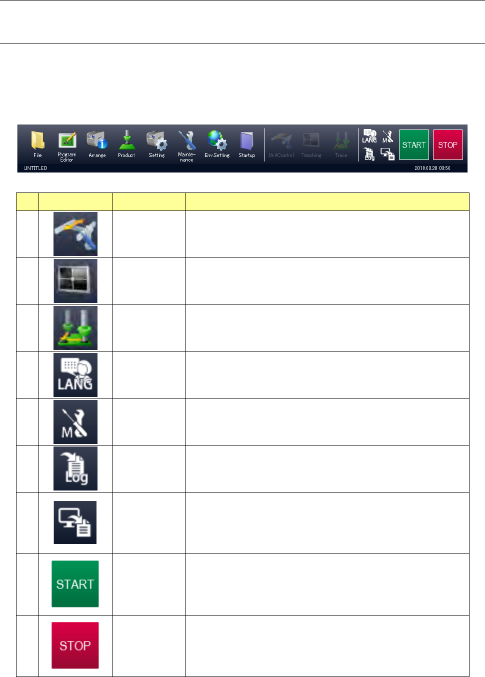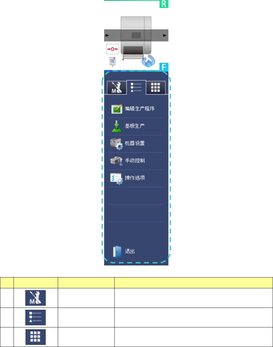 操作手册 1- 15 (2) 信息区 域的功能按钮 信息区域的功能 按钮配置在以下 位置,通过选 项卡切换显示使 用。 应用程序启动中 ,有可能任何 选项卡都无法选择。 No. 图标 名称 概要 1 维护选项卡 显示个别的维护信息显 示菜单。 2 应用程序快捷方式 显示应用程序快 捷方式及退出菜单。 3 键盘选项卡 显示软键盘。