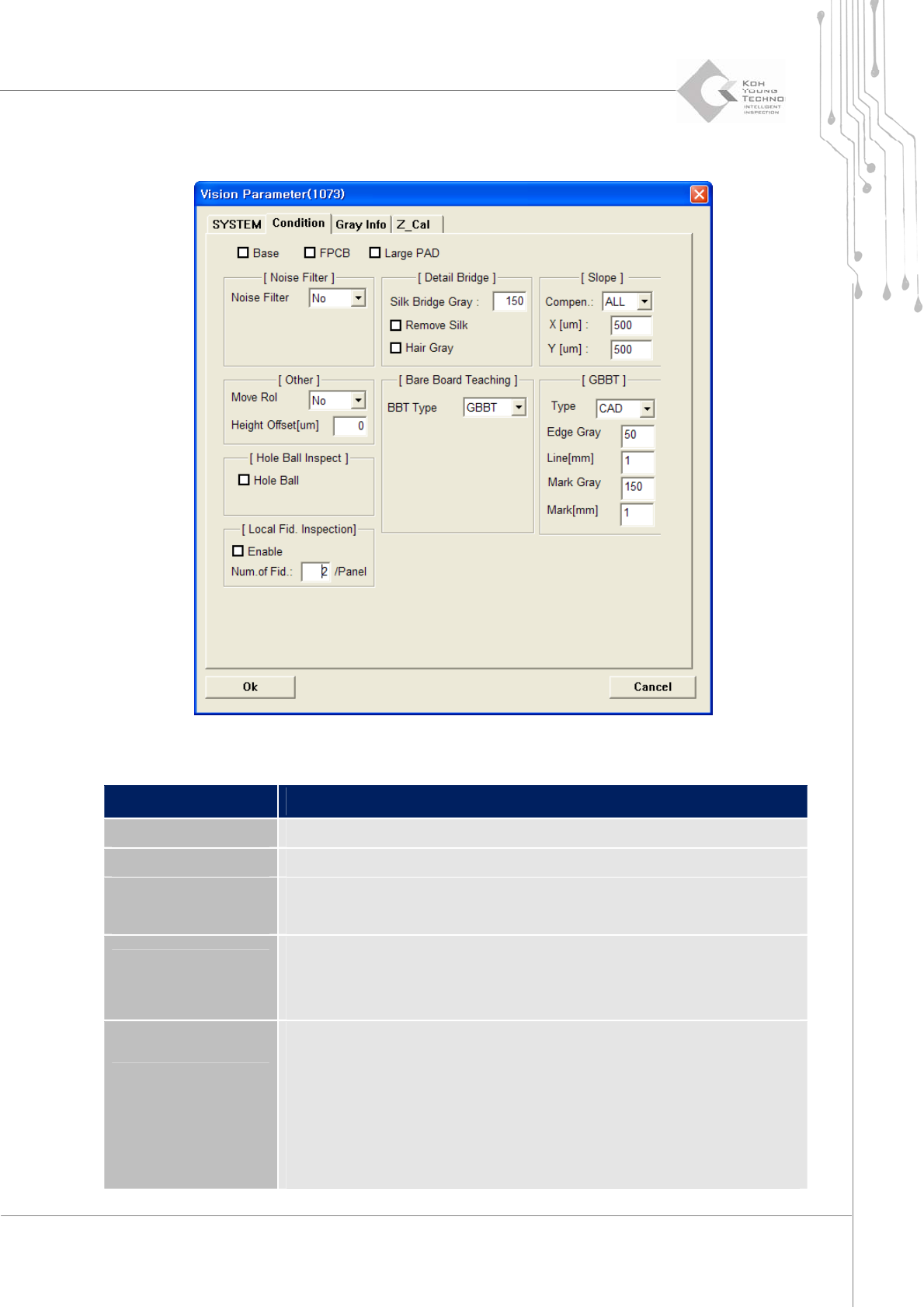 程序员手册 | 107 4.3.5.2. “ Inspection Condition ”(检测条件)对话框 图 4 ‐ 17. “ Inspection Condition ”(检测条件 )对话框 项目 说明 “ Base ”(基本) 将基准线从 ROI 延伸到 FOV 。 FPCB 针对弹性 PCB 补偿 ROI 中的曲率。 “ Large PA D ” (大型 Pa d ) …